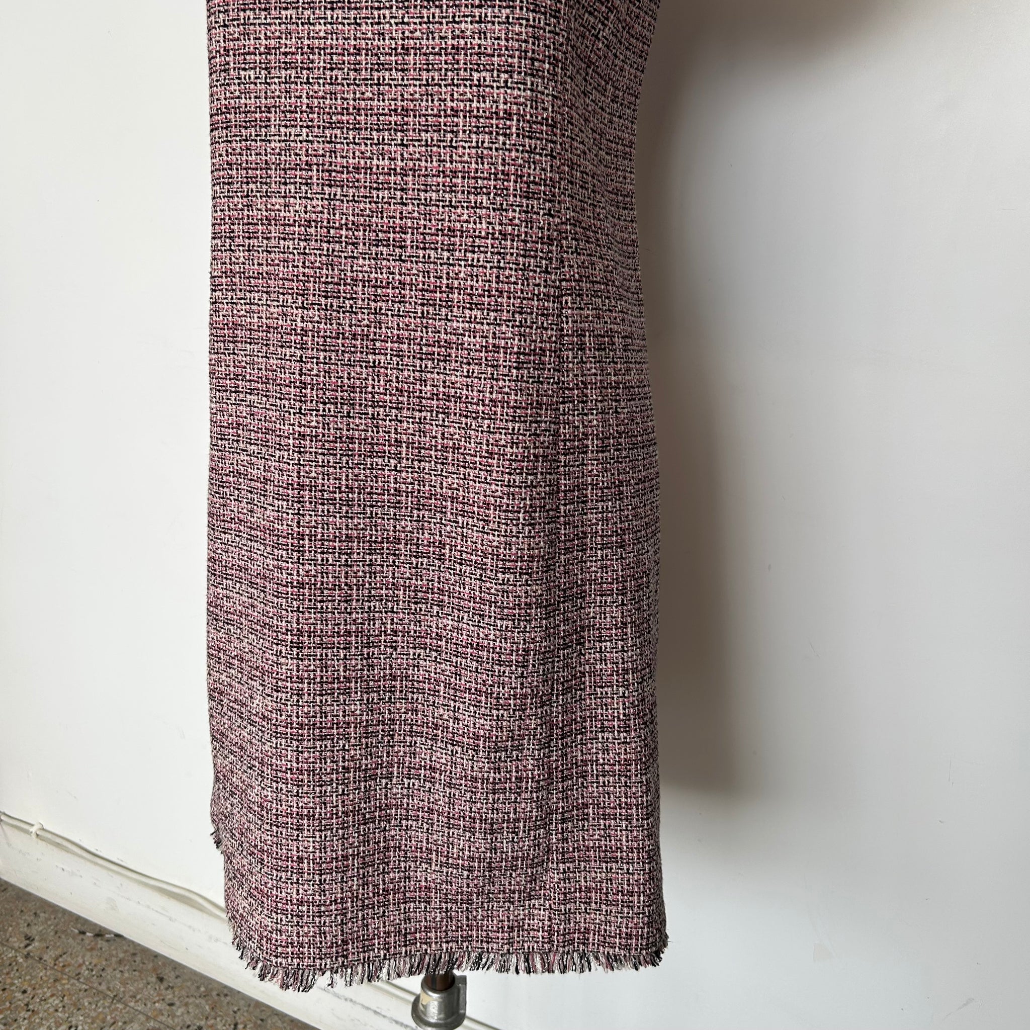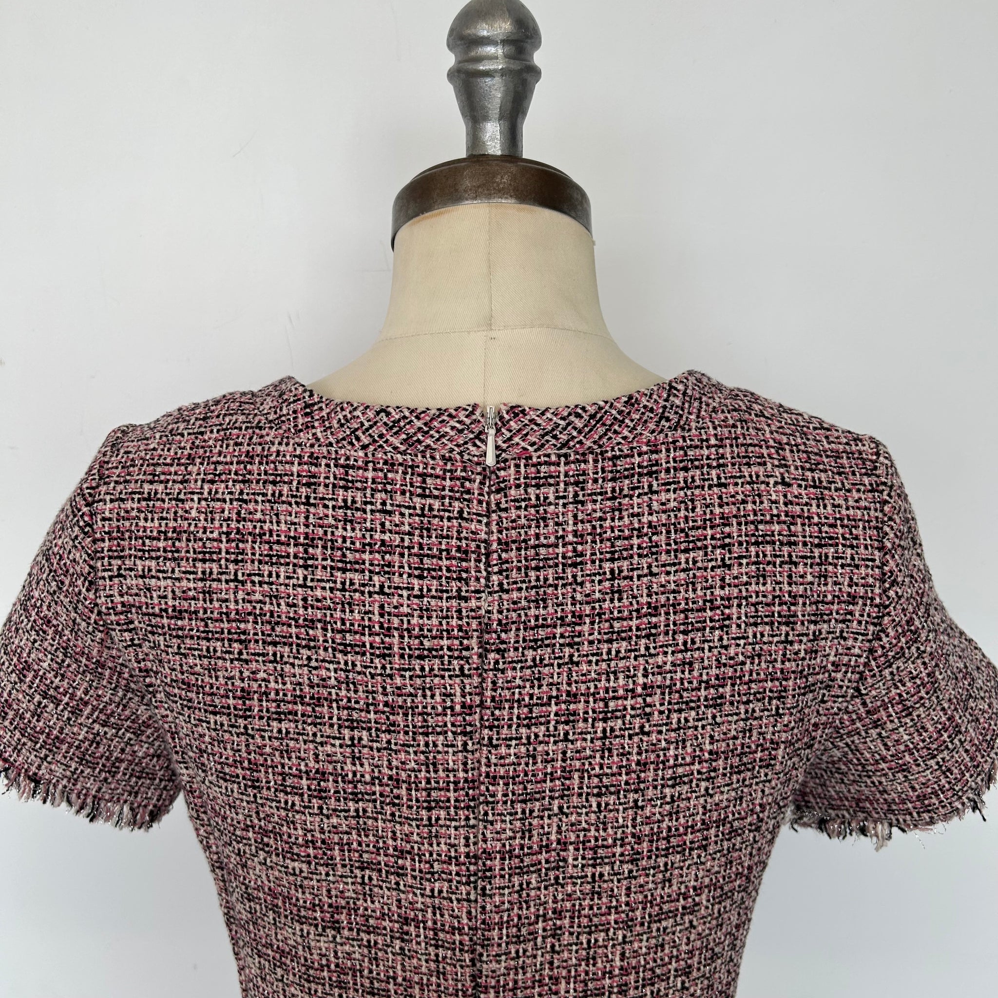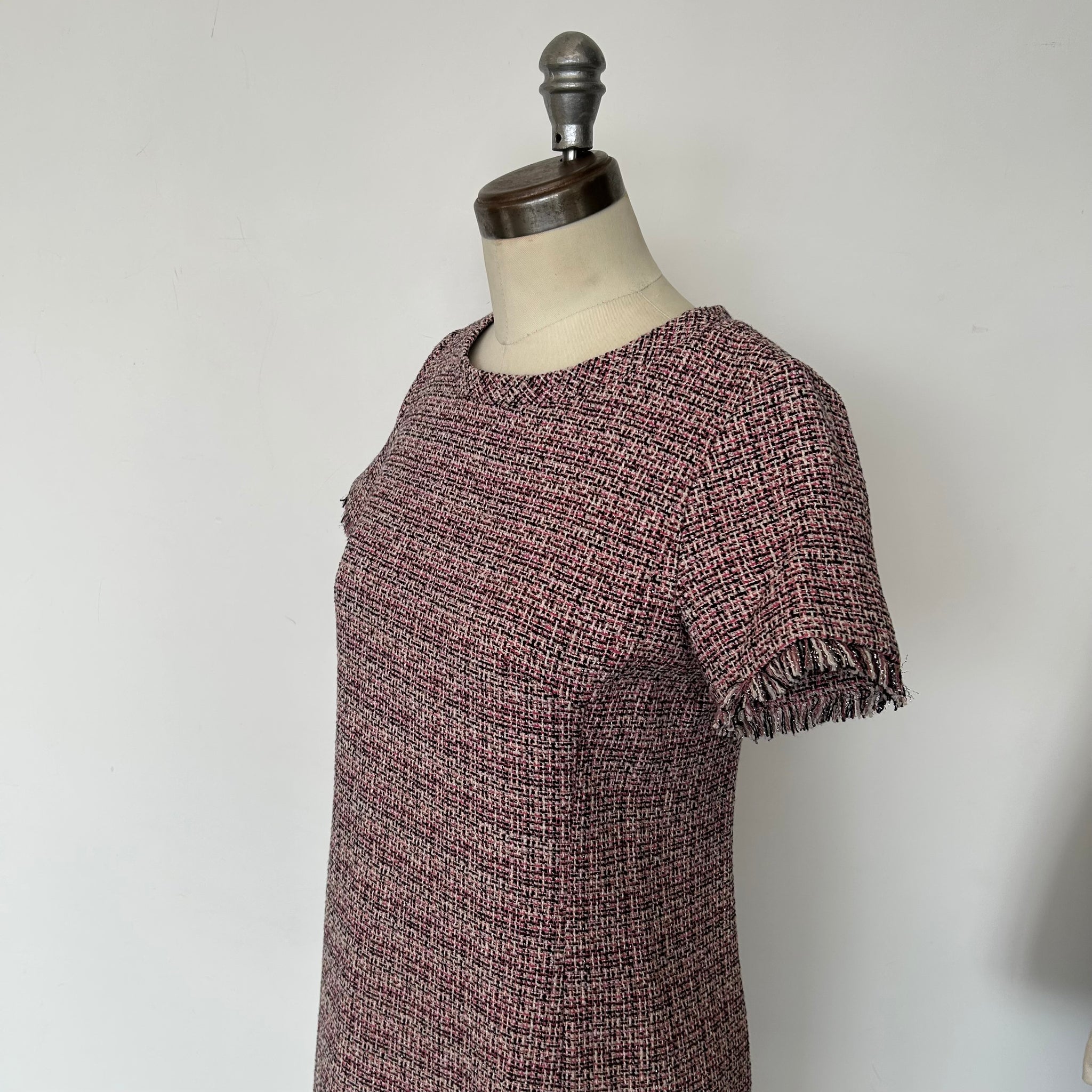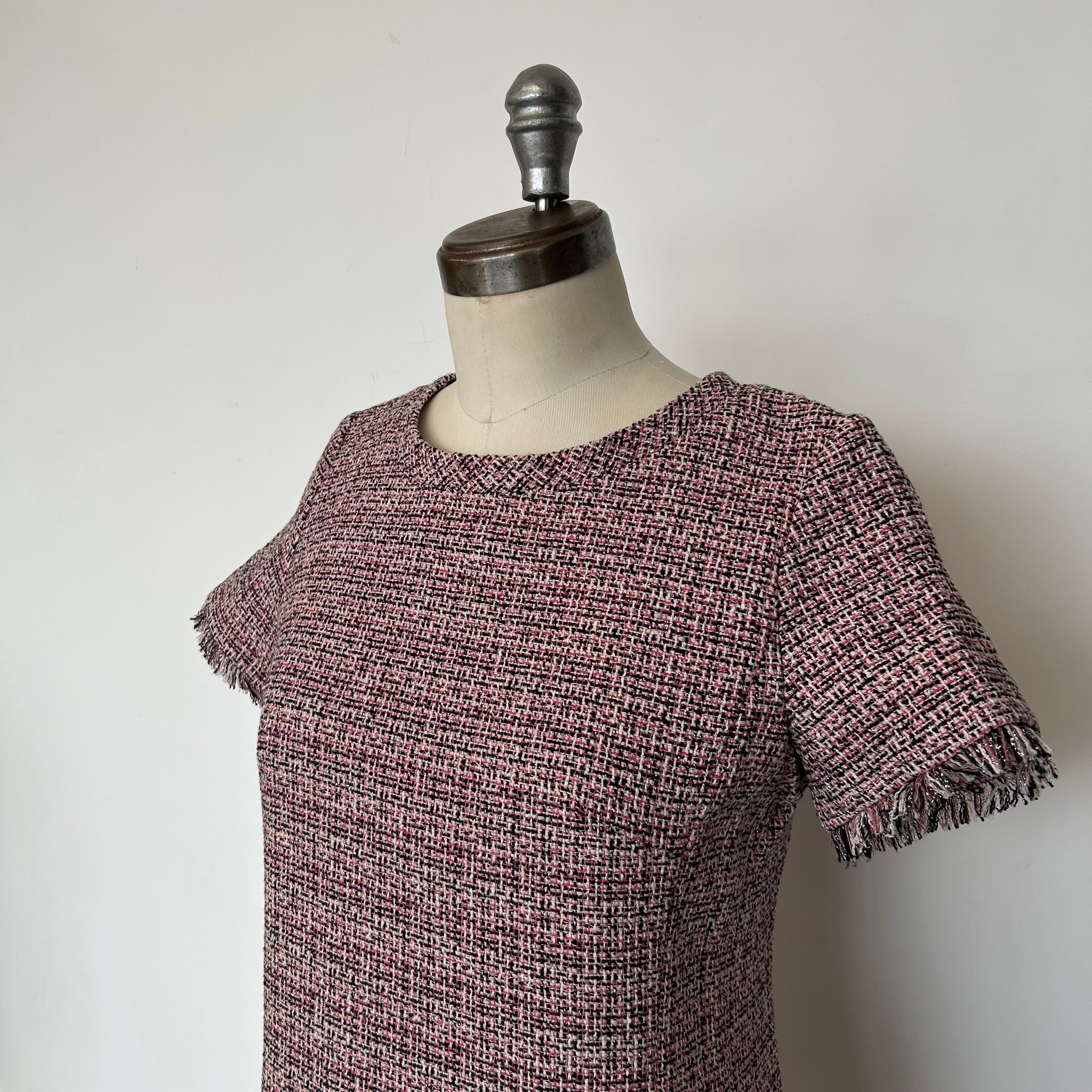 Robe en tweed à manches courtes de la marque Weekend MaxMara. Avec mince doublure, col rond fermeture éclair à l'arrière et petites décorations de franges aux manches et au bas de la robe.