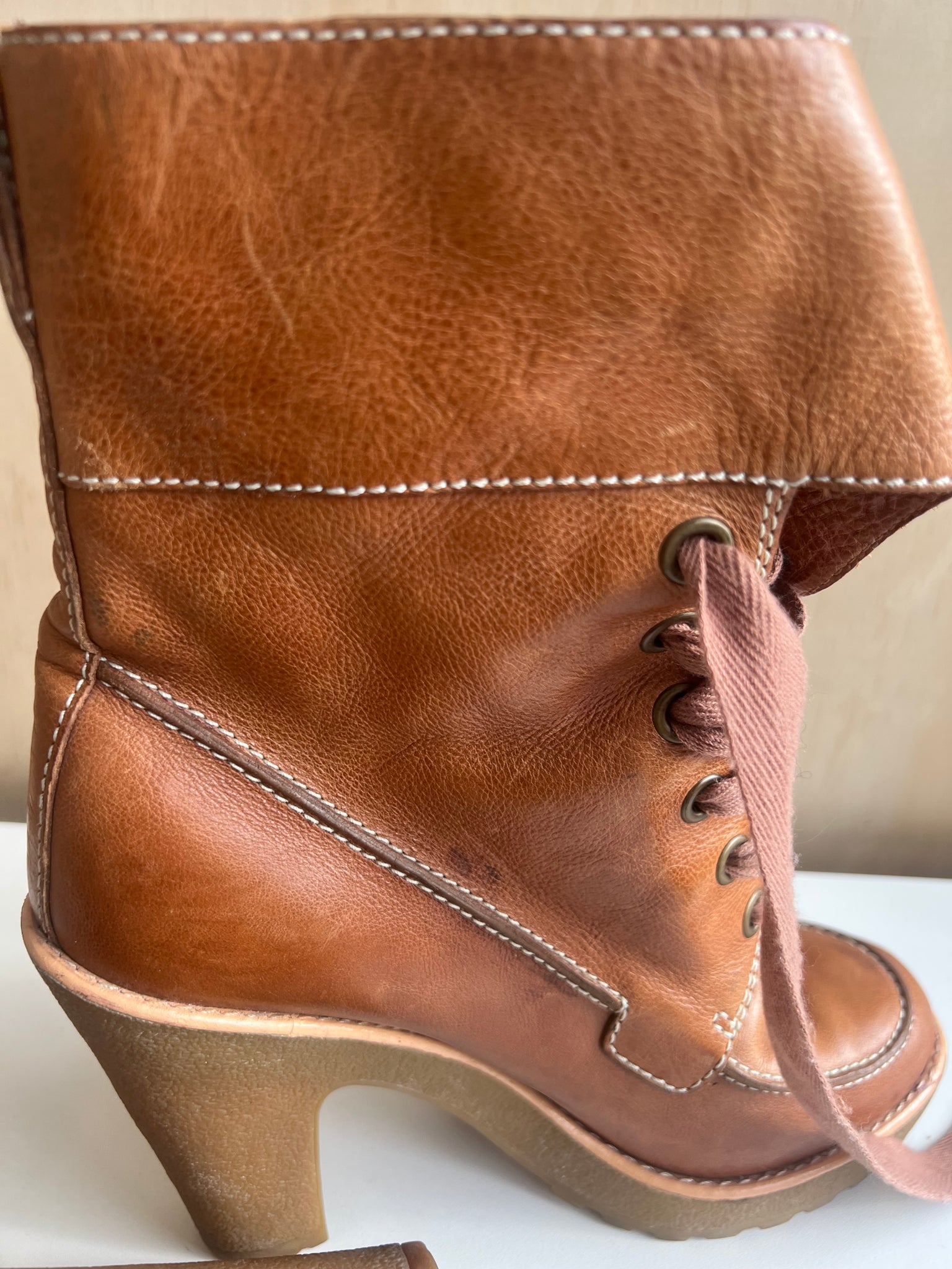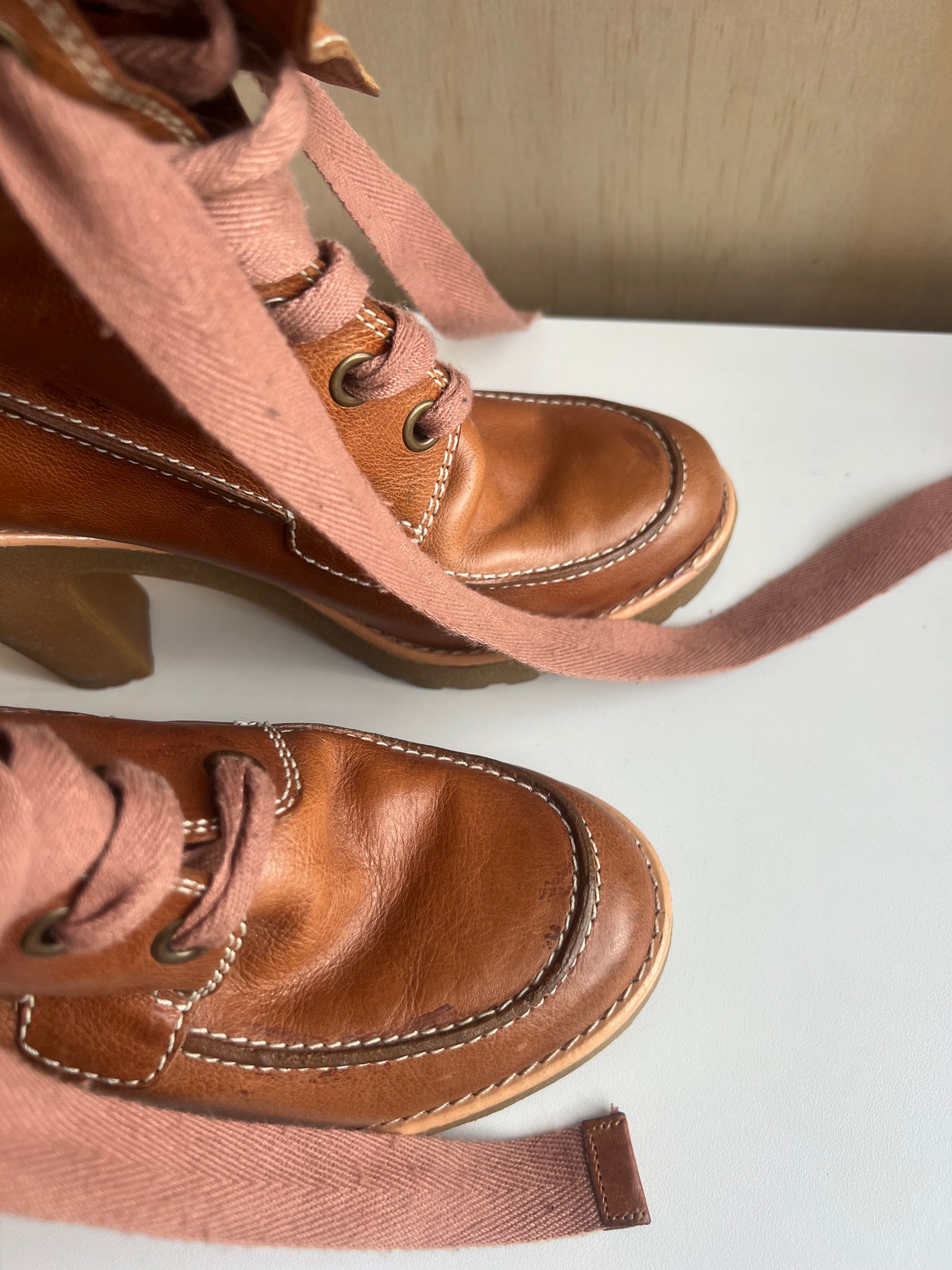 Bottines montante de la marque Marc Jacobs à talons en cuir avec gros lacets. Avec deux anneaux sur ganses ajustables.