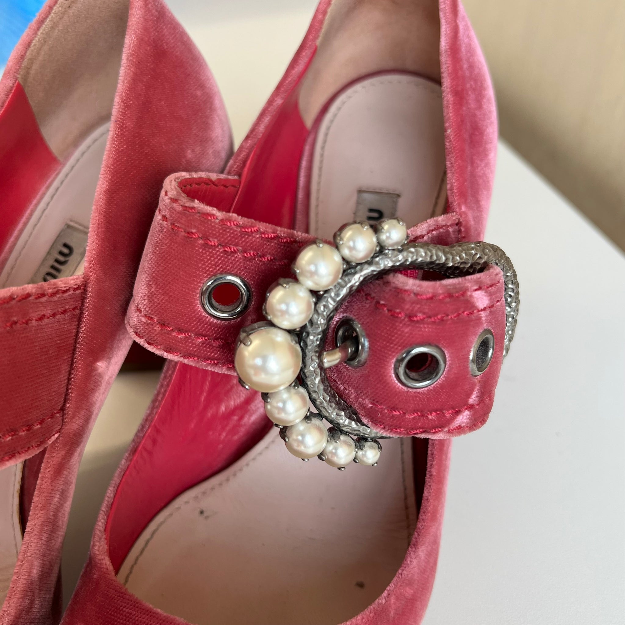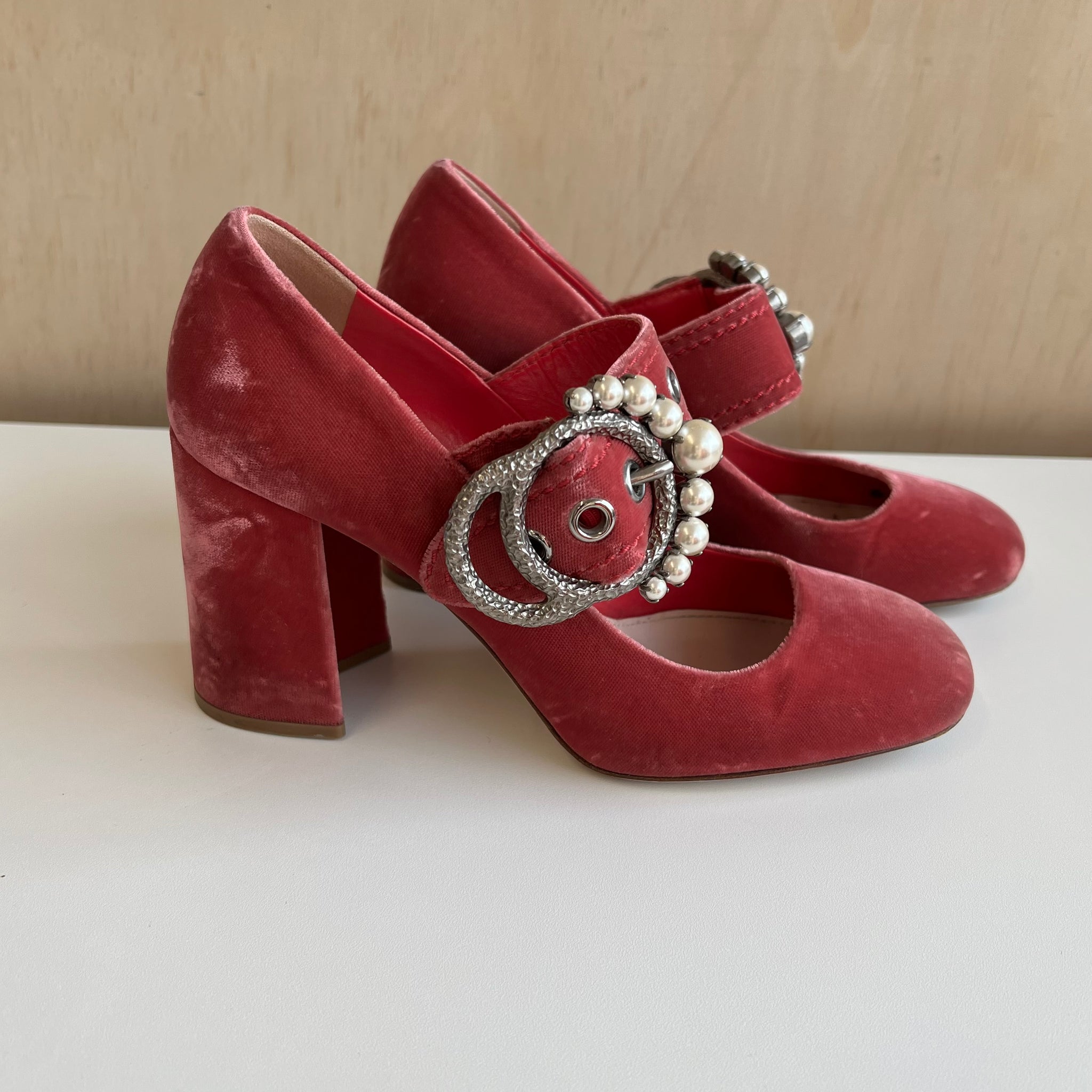 Chaussures à talons hauts de la marque Miu Miu style Mary Jane au fini de velours. Avec grosse boucle ajustable argentée foncé avec fausses perles. Bouts ronds. D'une valeur de plus de 400$