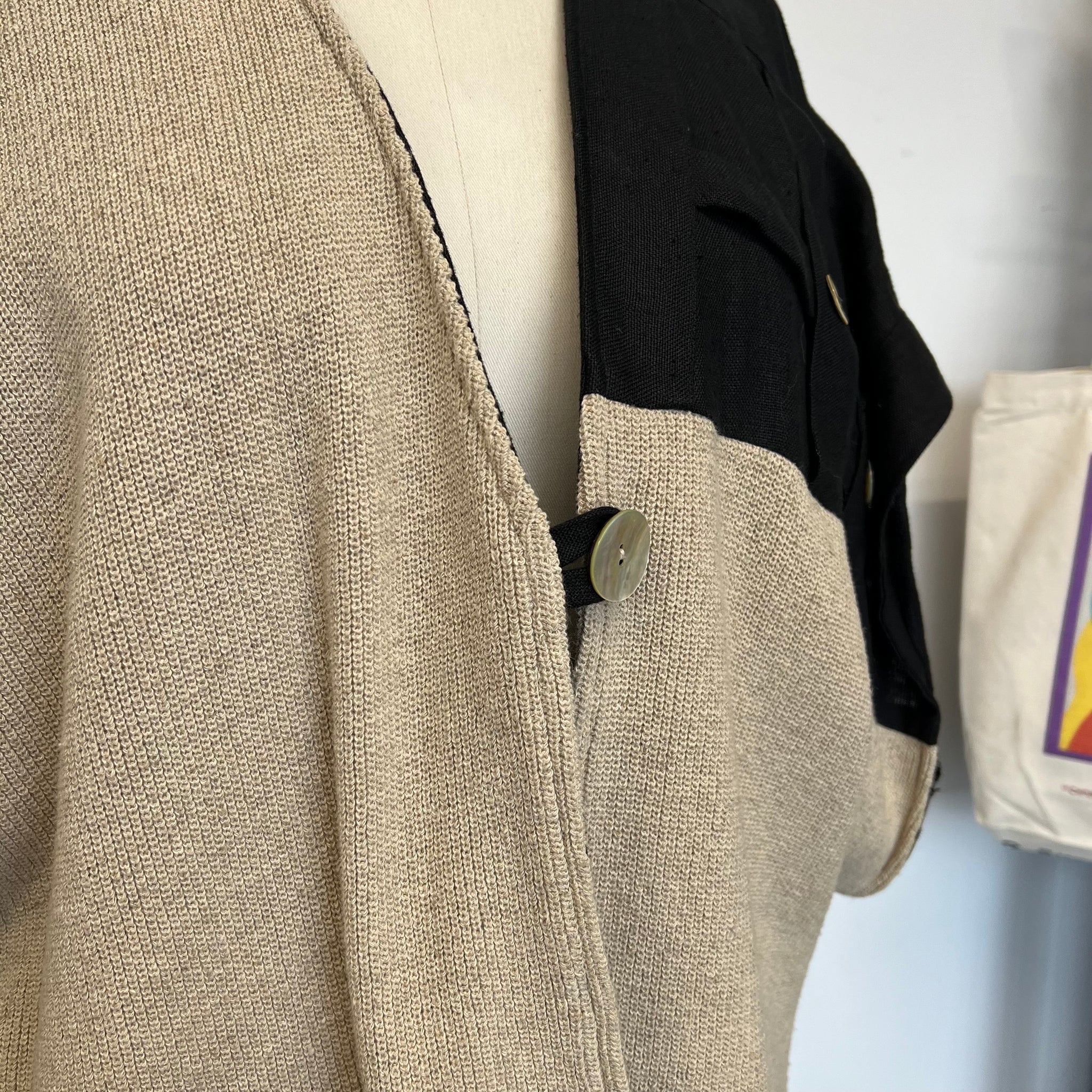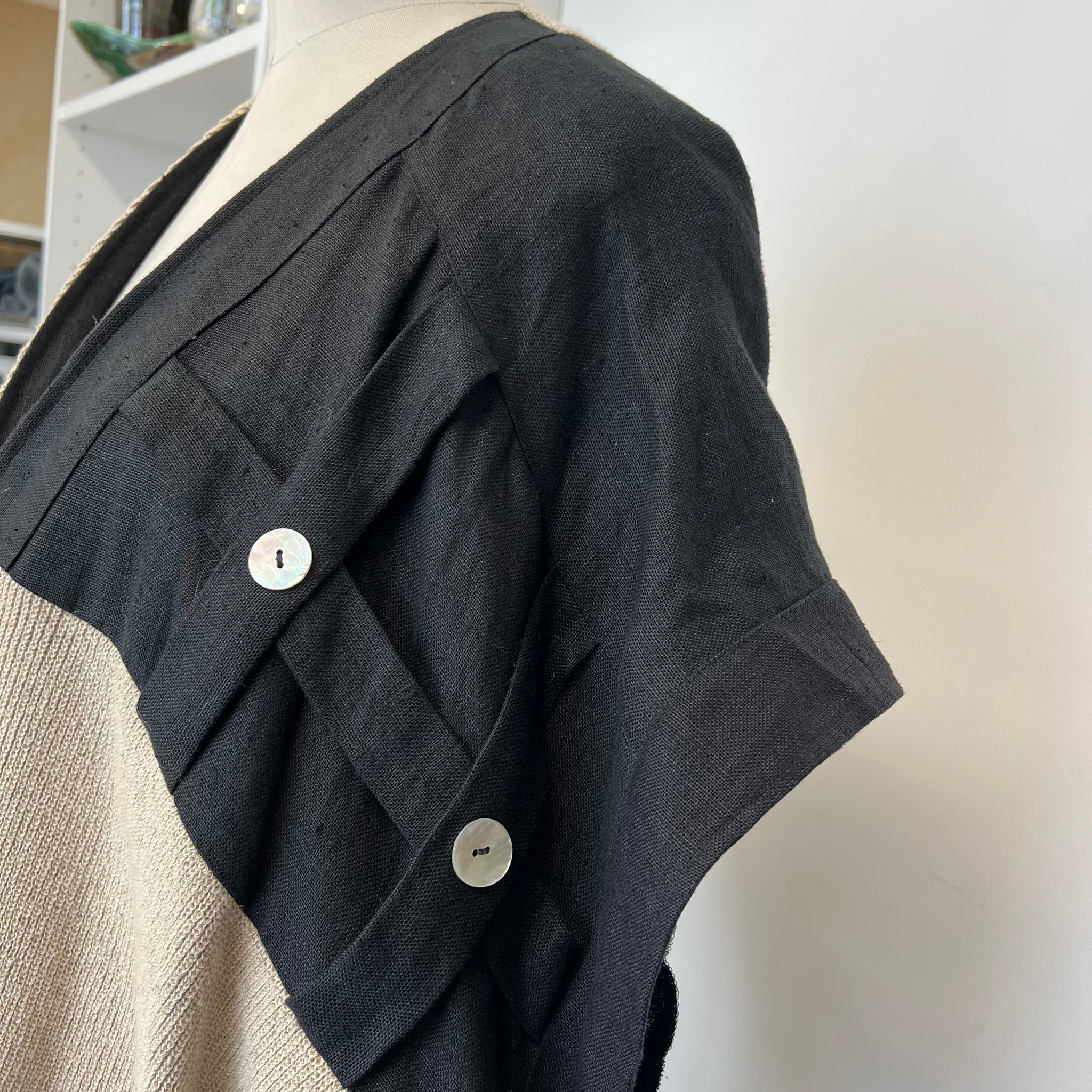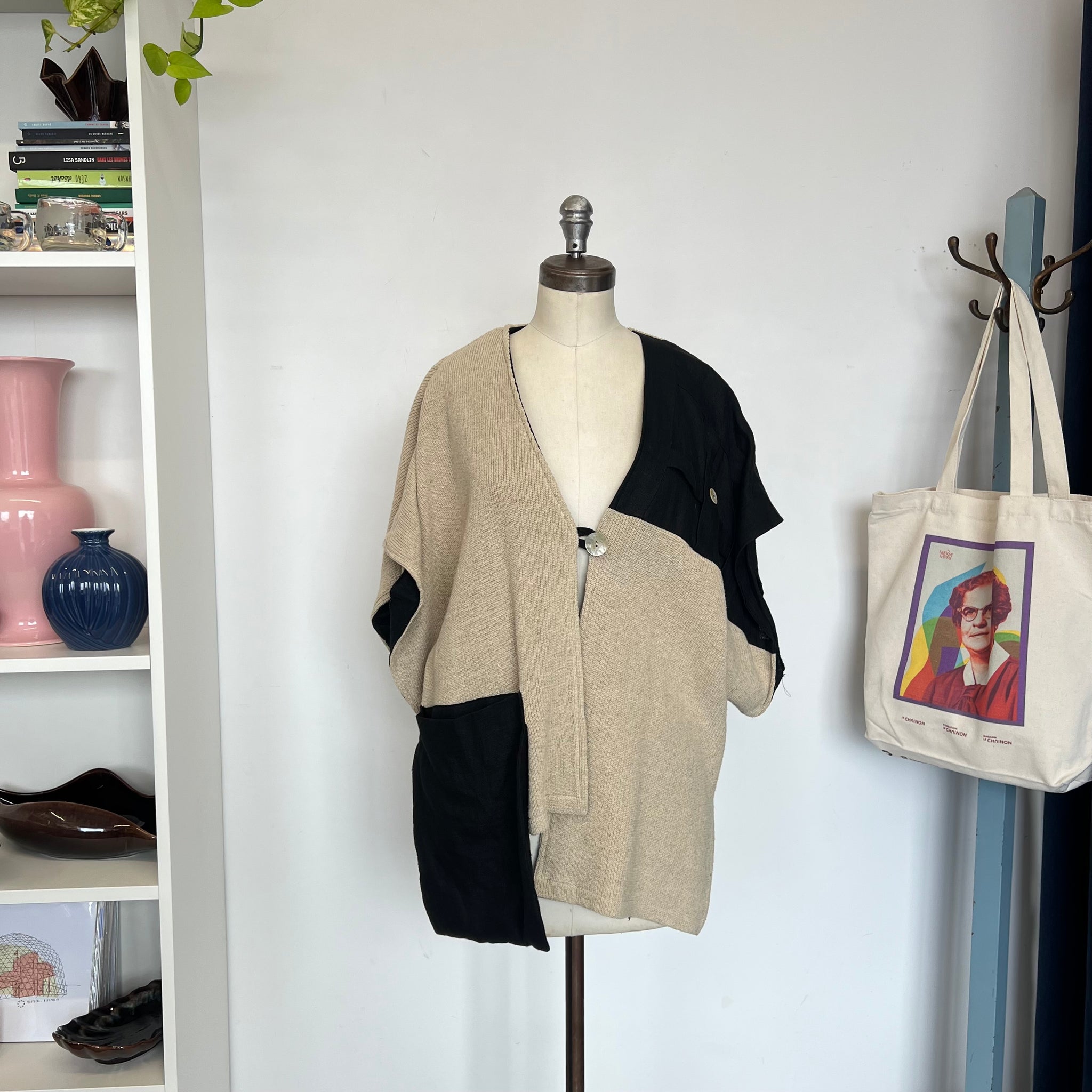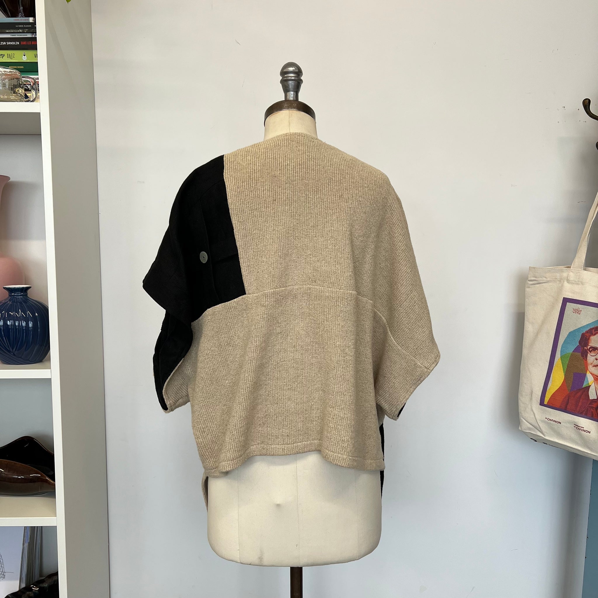Veste vintage en lin de la marque Shepar's Linnen Clothing New York - Amsterdam - Berlin. S'attache avec un bouton. Taille unique très ample et asymétrique, peut faire comme un par dessus. Avec une grosse poche. Manches très amples.