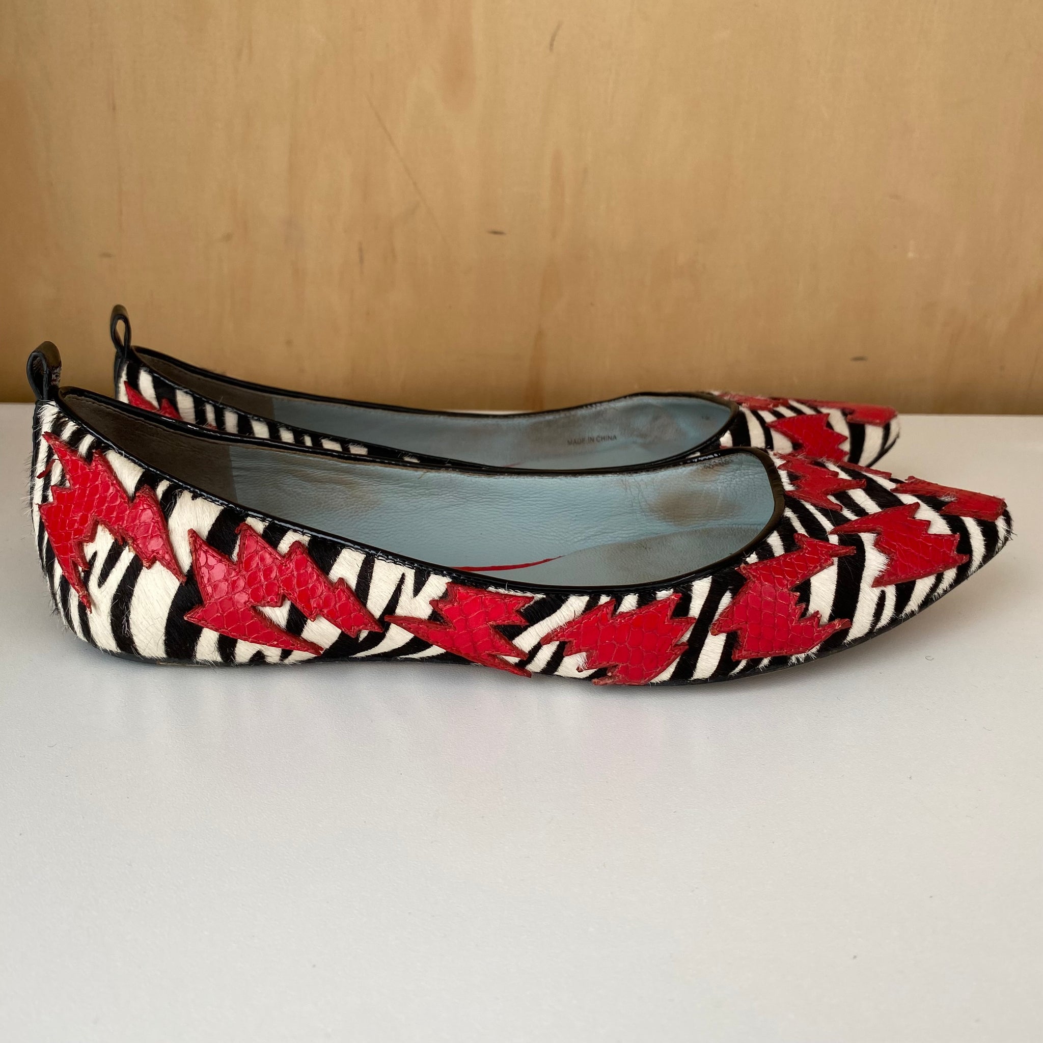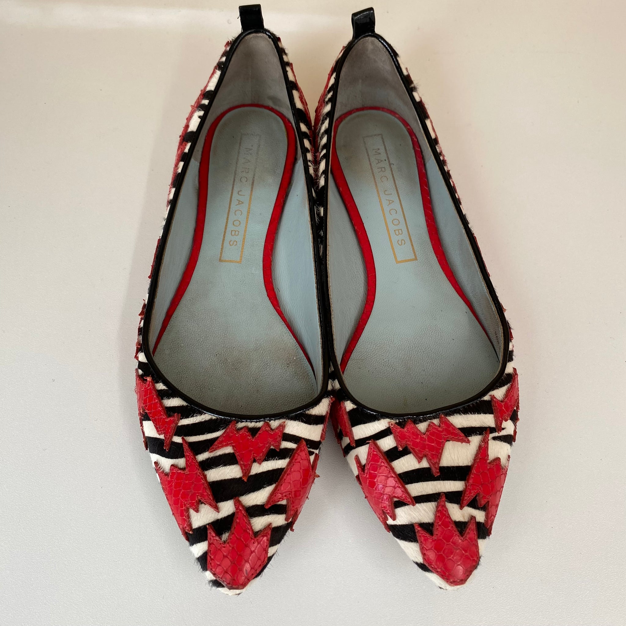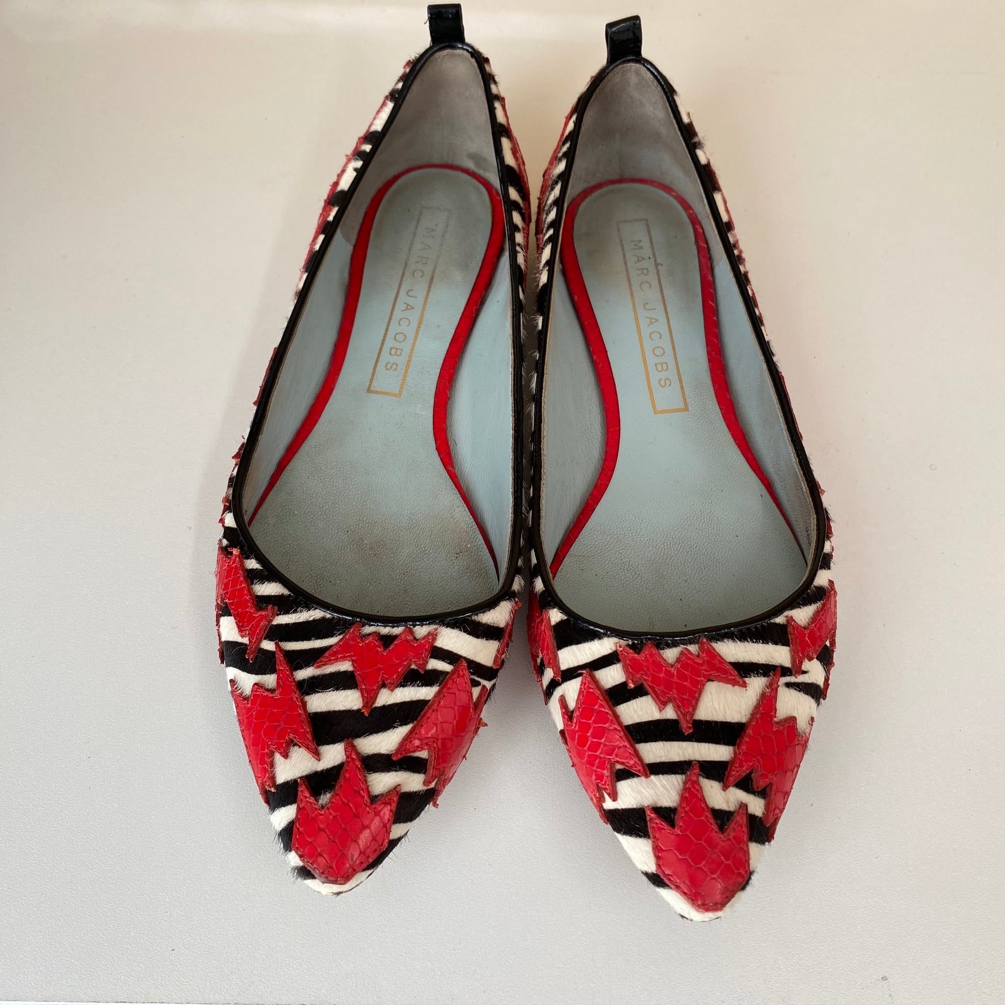 Chaussures ballerines vintage pointues Marc Jacobs. Décorations rouges à relief crocodile sur un fond de motif zébré texturé (poils).