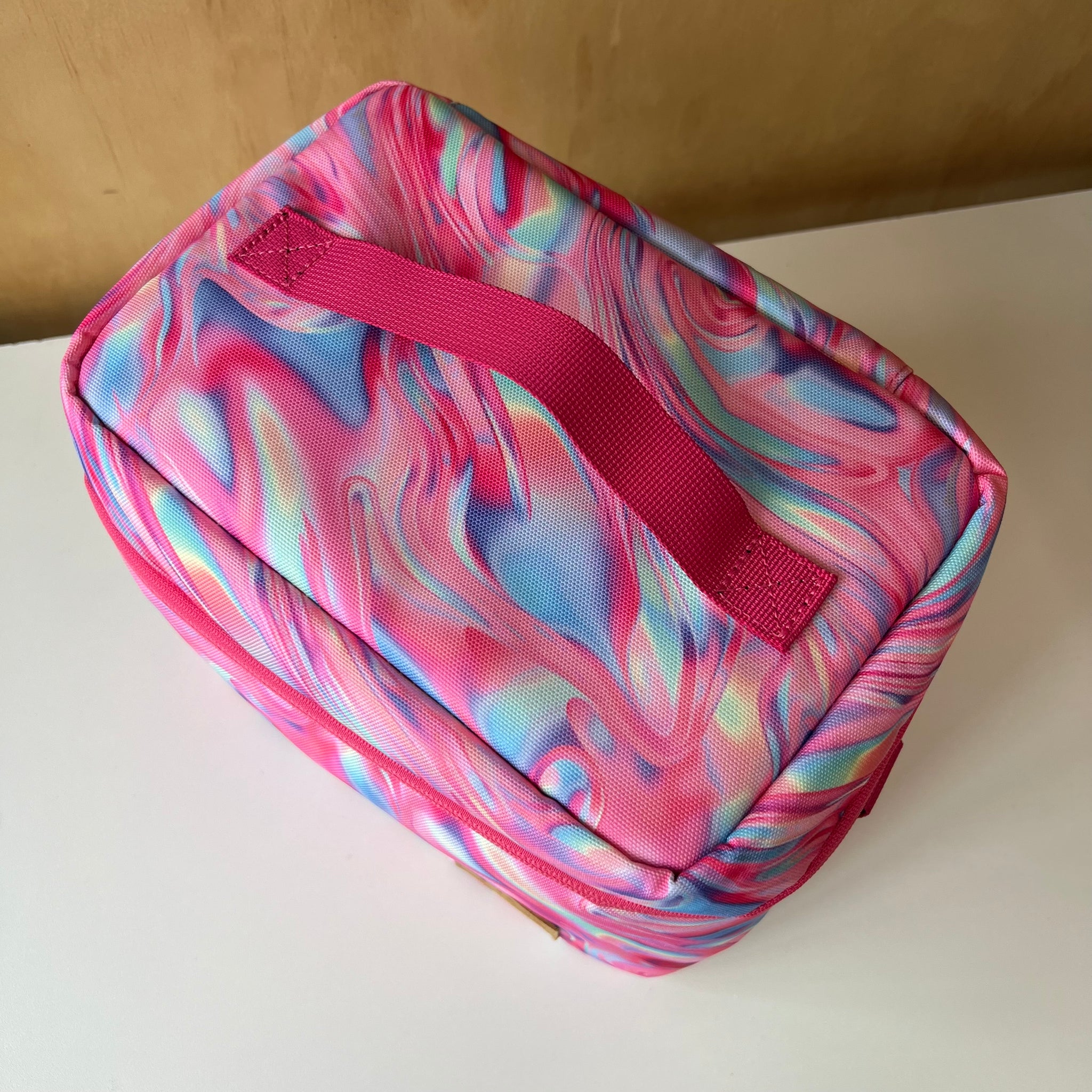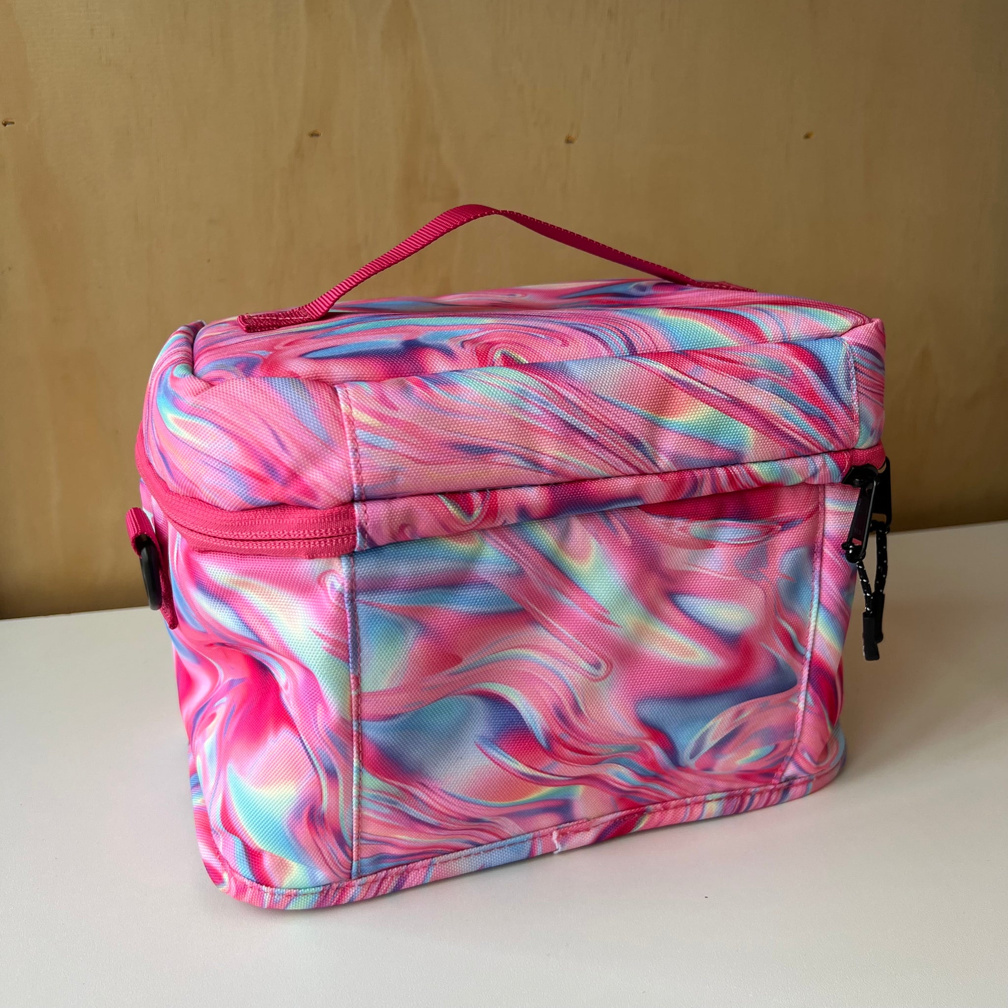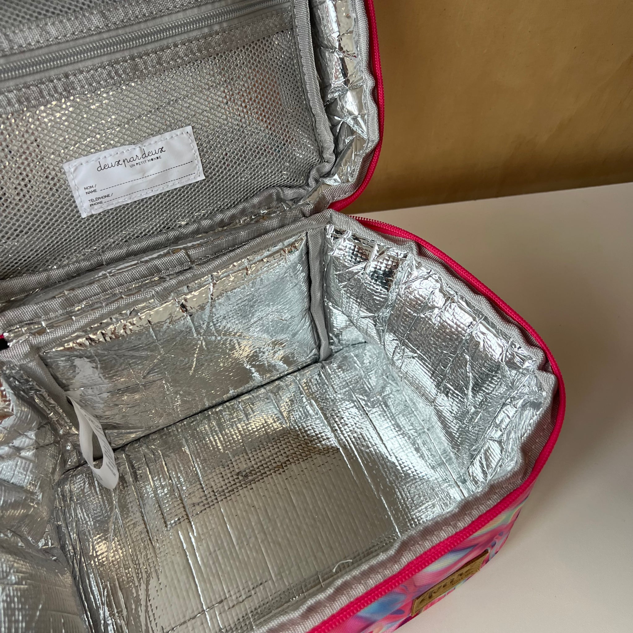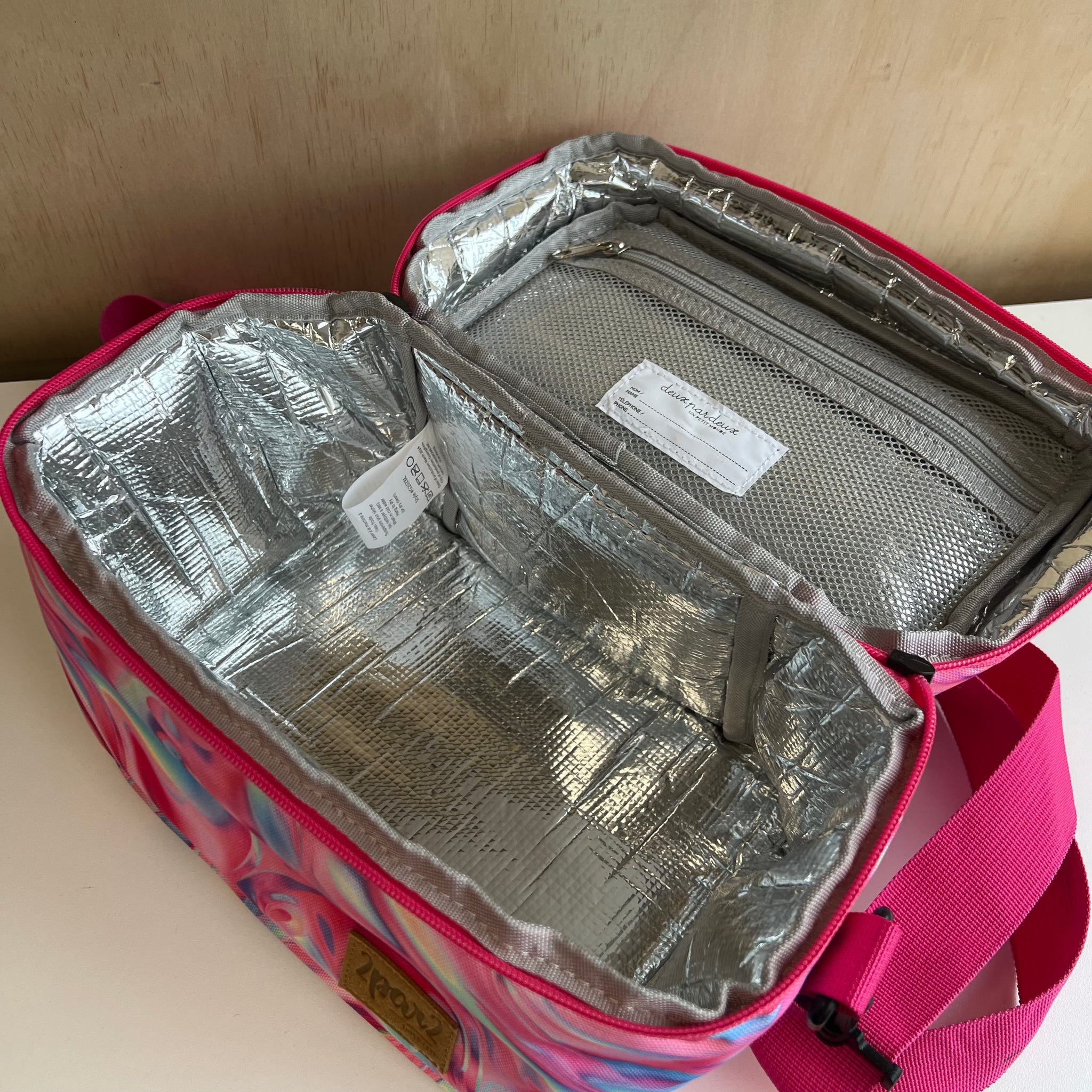 Boite à lunch de grand format à imprimé de fleurs mauves, parfait pour tous les types de contenants. Poche intérieure zippée en mesh pour les ustensiles, serviettes ou autres petits articles. Le compartiment principal isotherme maintient les articles chauds ou froids. Avec étiquette d'indentification intérieure pour nom et téléphone. Laver à la machine à l'eau froide, suspendre pour sécher (ou nettoyer à sec).