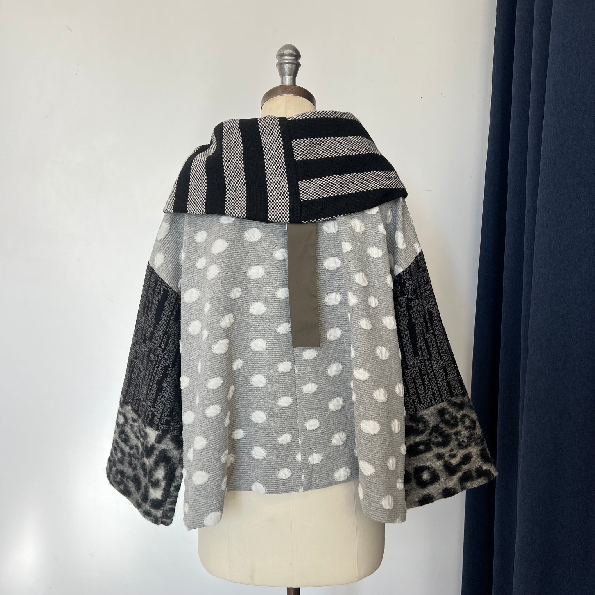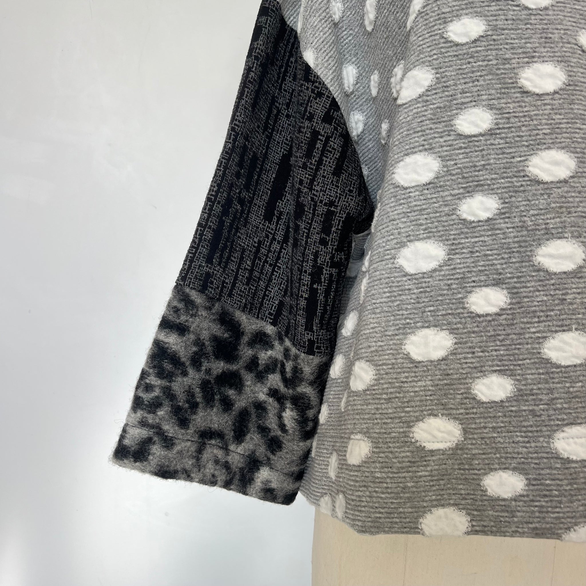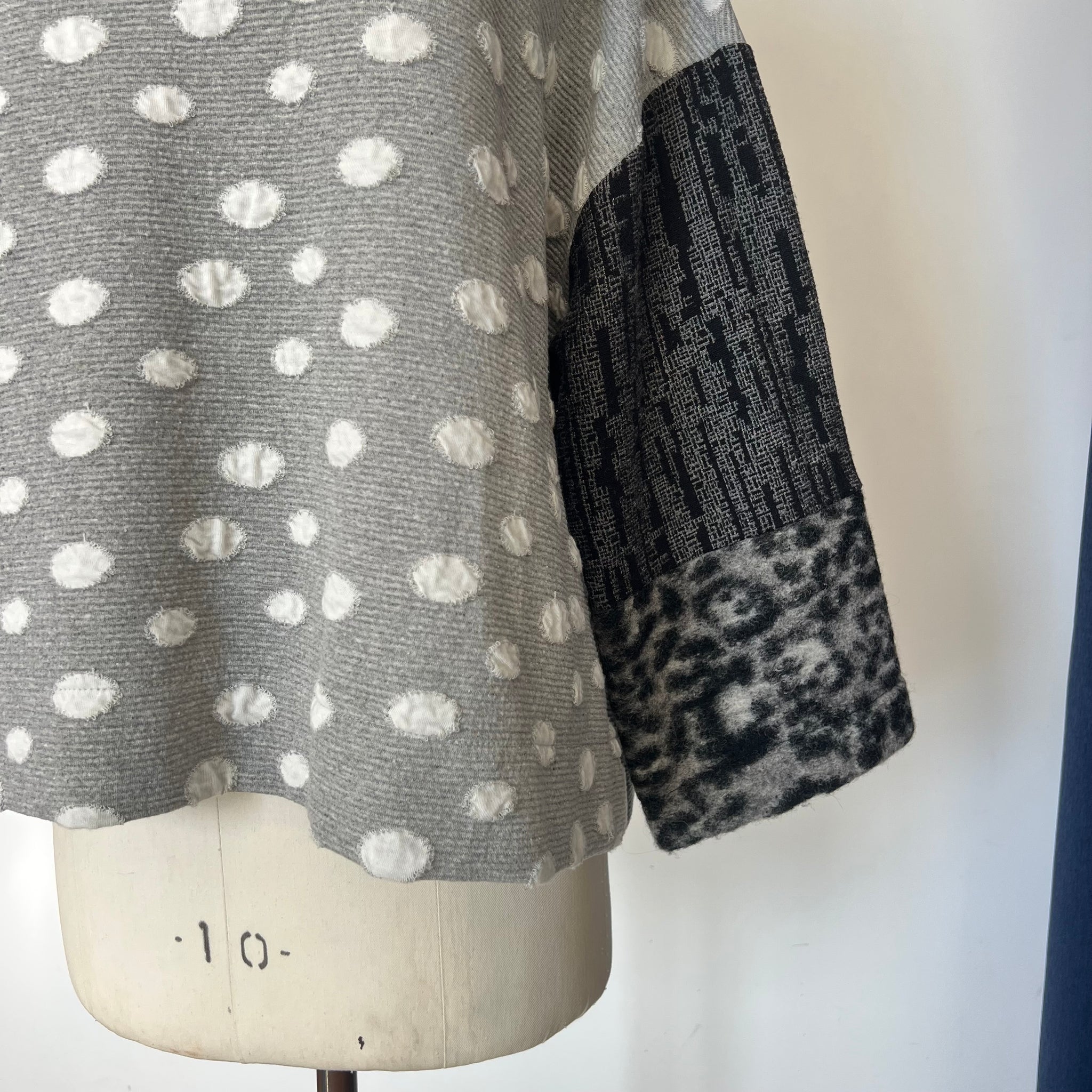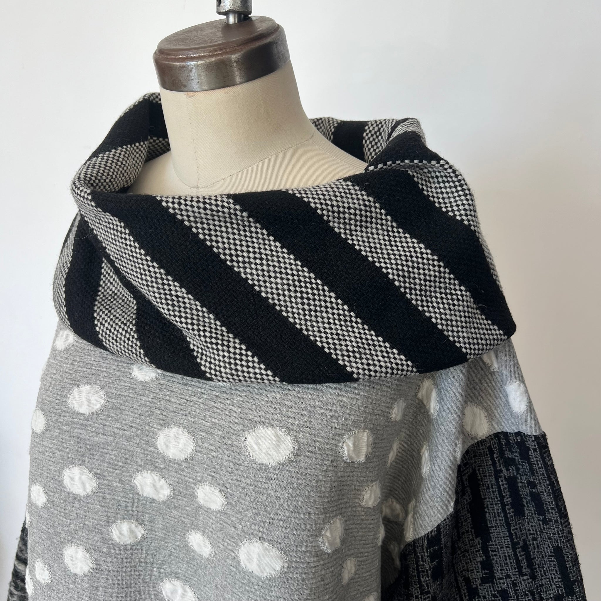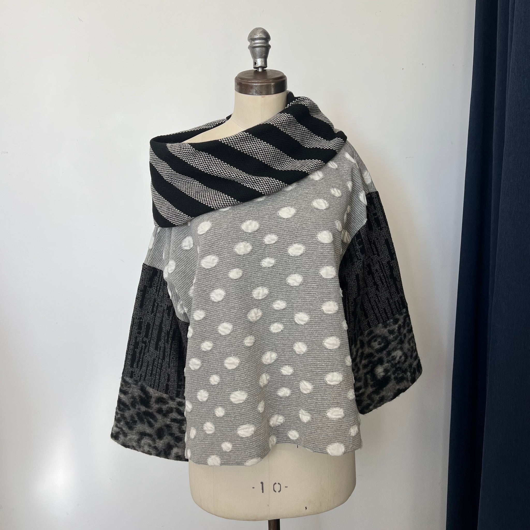 Chandail ample de la marque Kedem Sasson. Motifs texturés divers, tissu non doublé et gros collet à rebords.