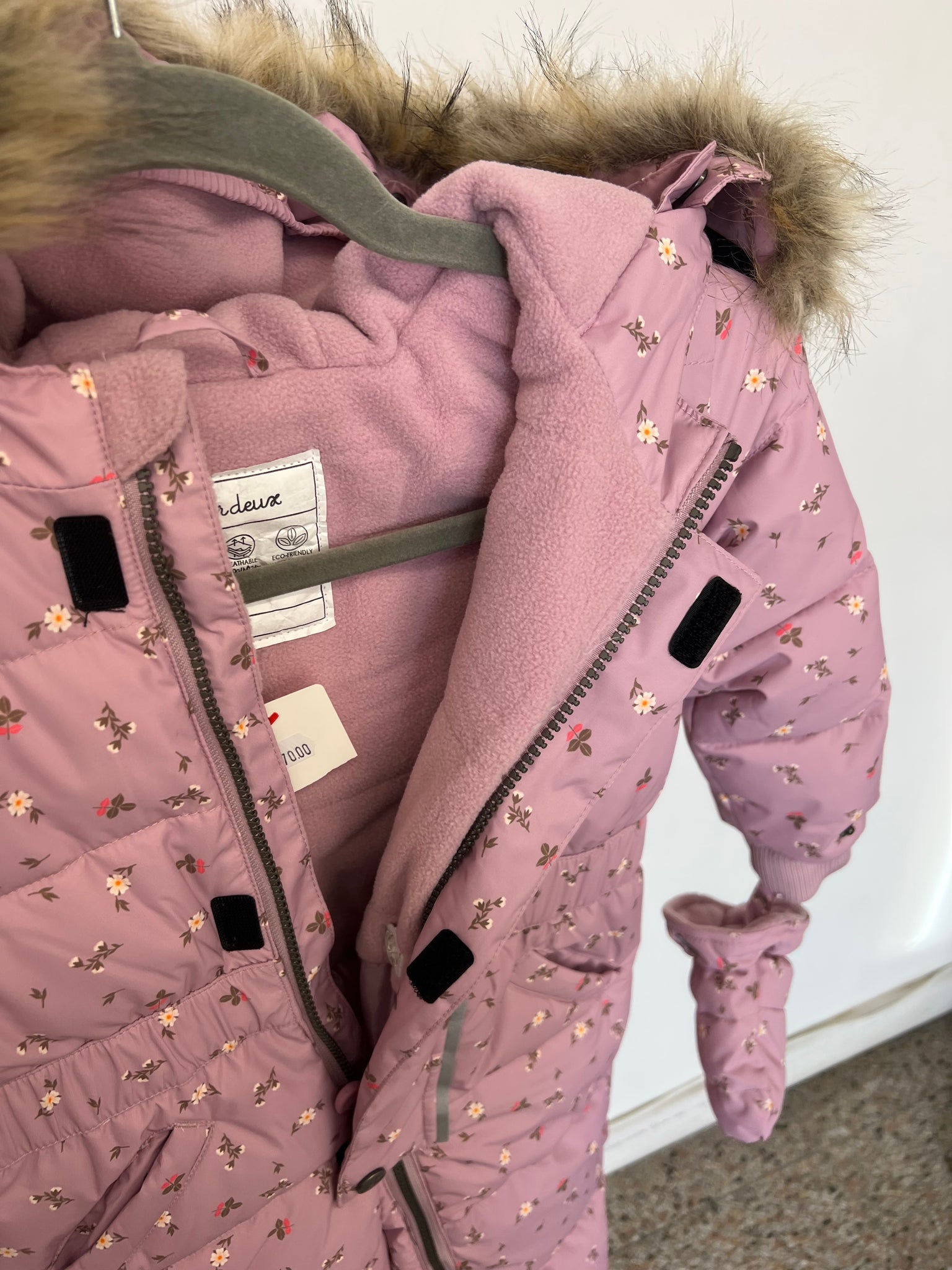 Manteau d’hiver une pièce doublé en polar pour bébé de la marque Deux par Deux. Tissu enduit d'un revêtement de polyuréthane qui le rend résistant aux intempéries et permet d'évacuer l'humidité. Fermoir principal de qualité supérieure Ykk® robuste. Taille ajustable par l'intérieur. Pare-neige aux chevilles avec bande élastique caoutchoutée. Sangles en caoutchouc réglables au bas des jambes pour bien tenir en place les bottes. Bottines et mitaines amovibles avec boutons-pression doublé de polar. Capuchon avec fourrure synthétique amovible. Isolation contre le froid jusqu'à -30°C(Ou -22°F). Avec une ouverture à fermeture éclair à l'avant qui descend jusqu'à l'entrejambe. Avec deux petites poches latérales.