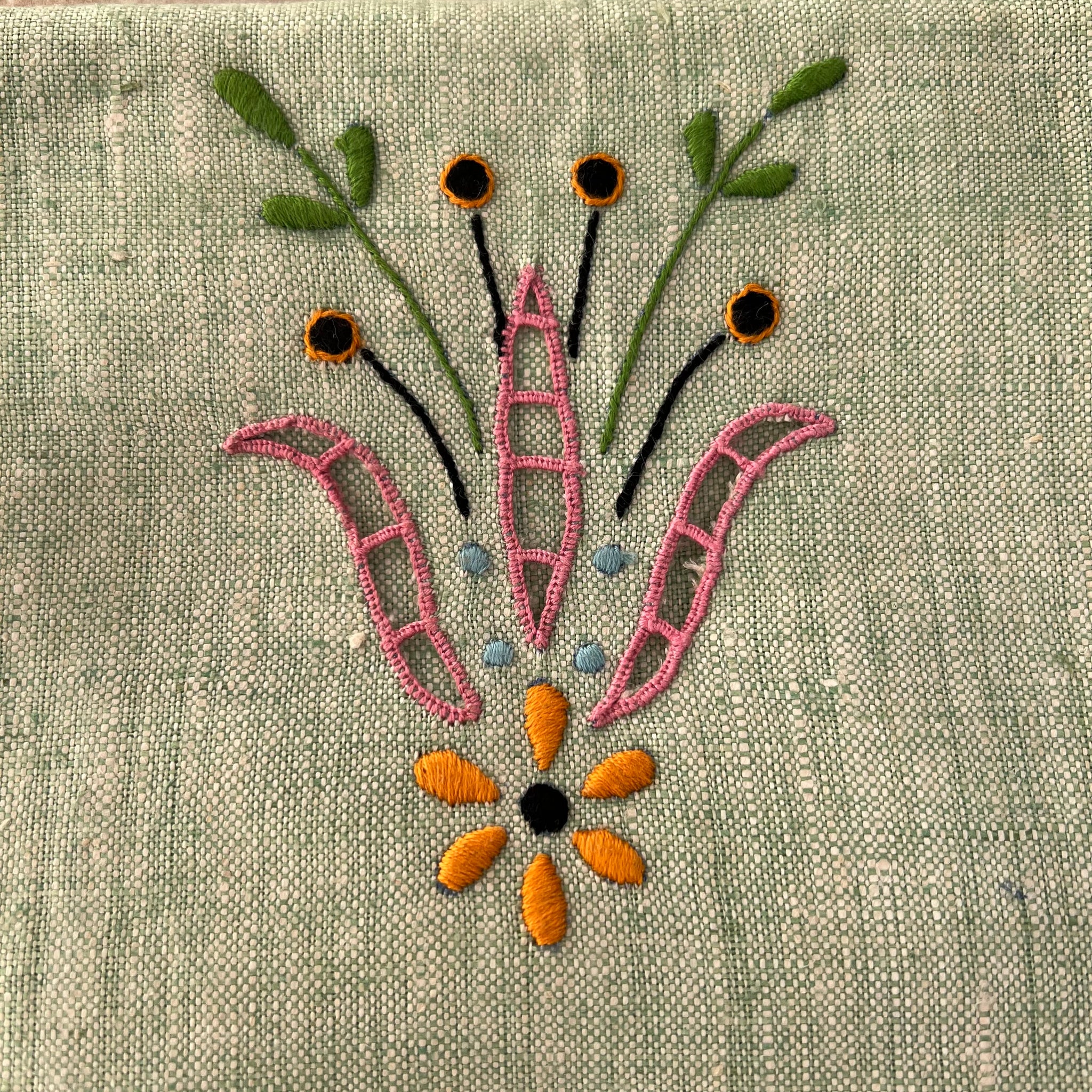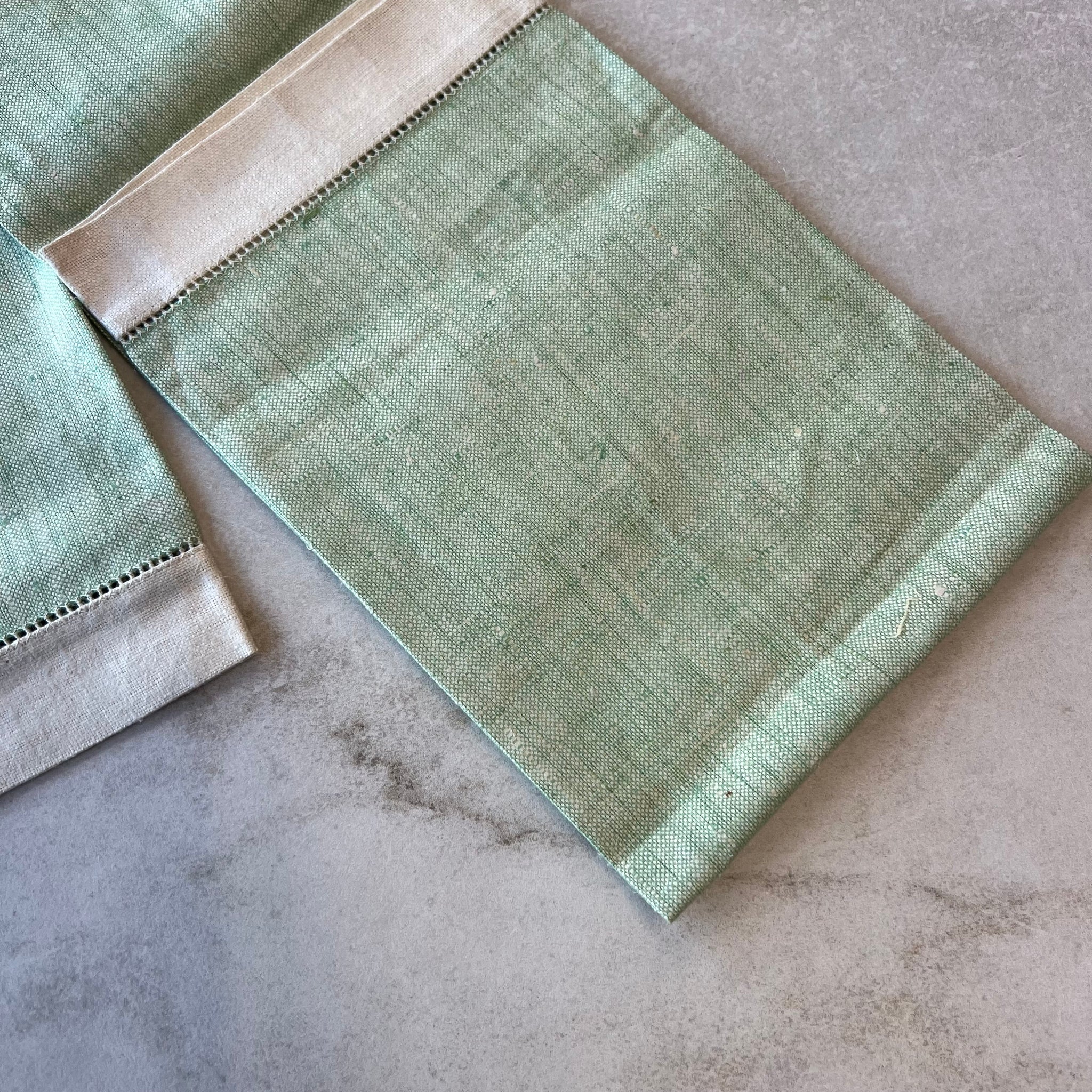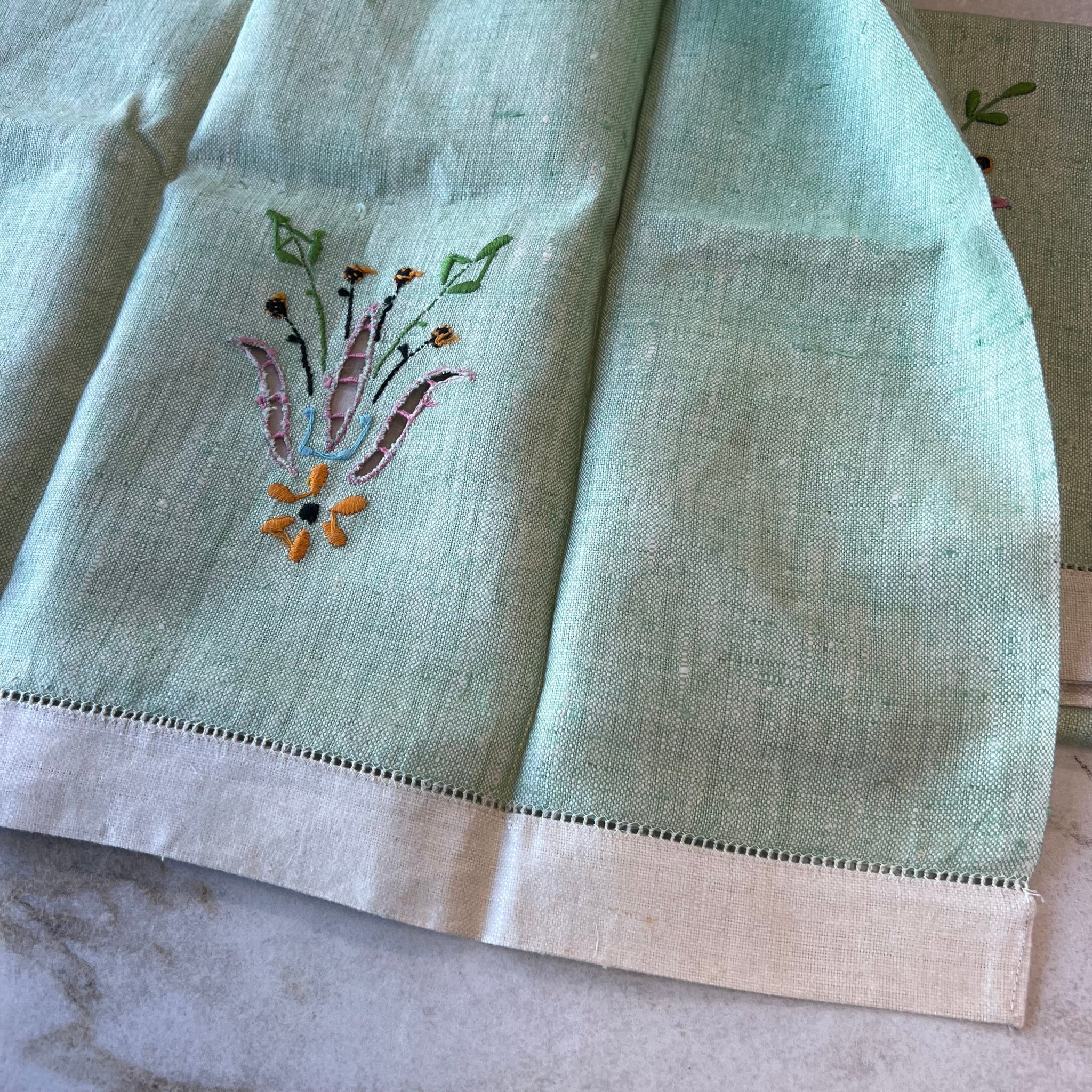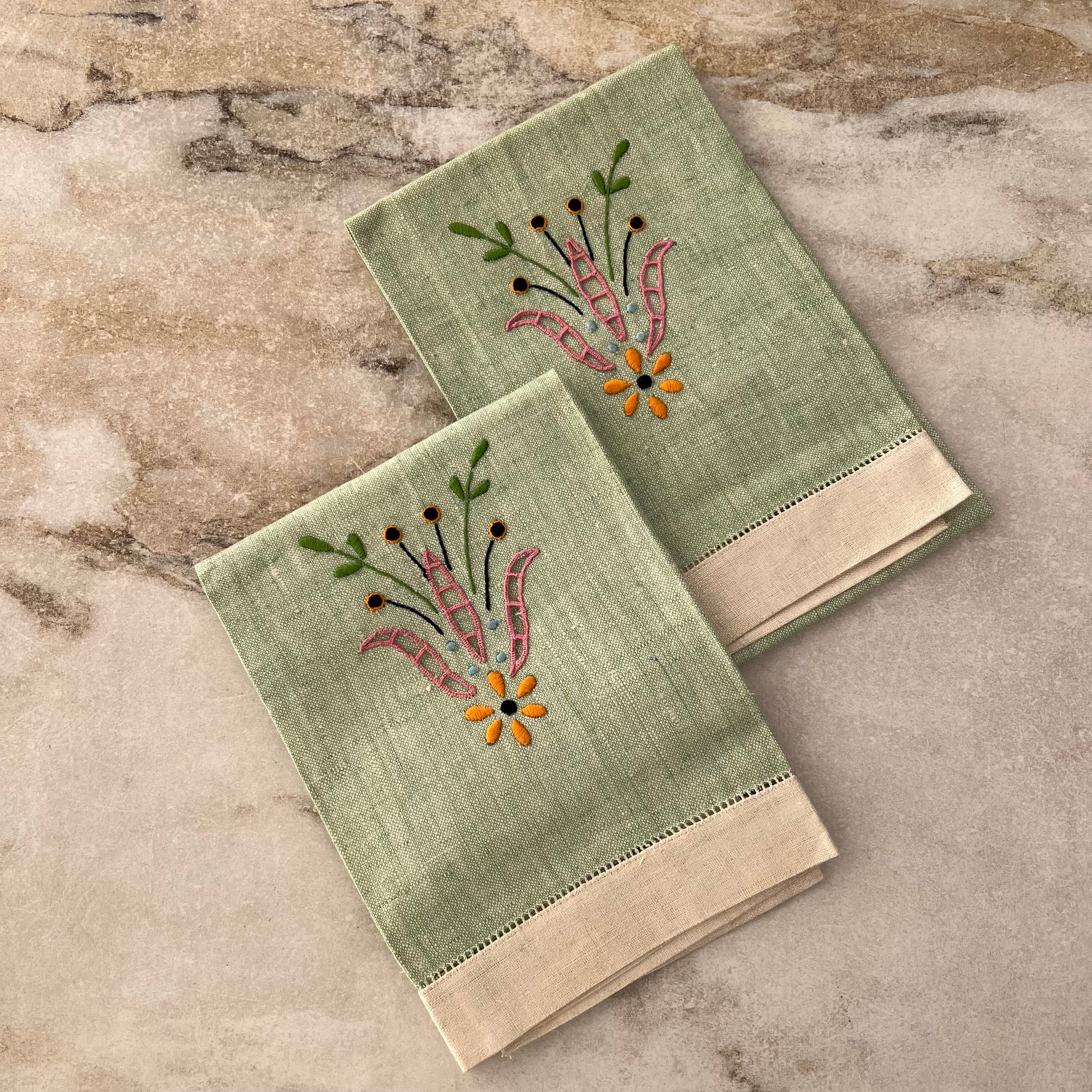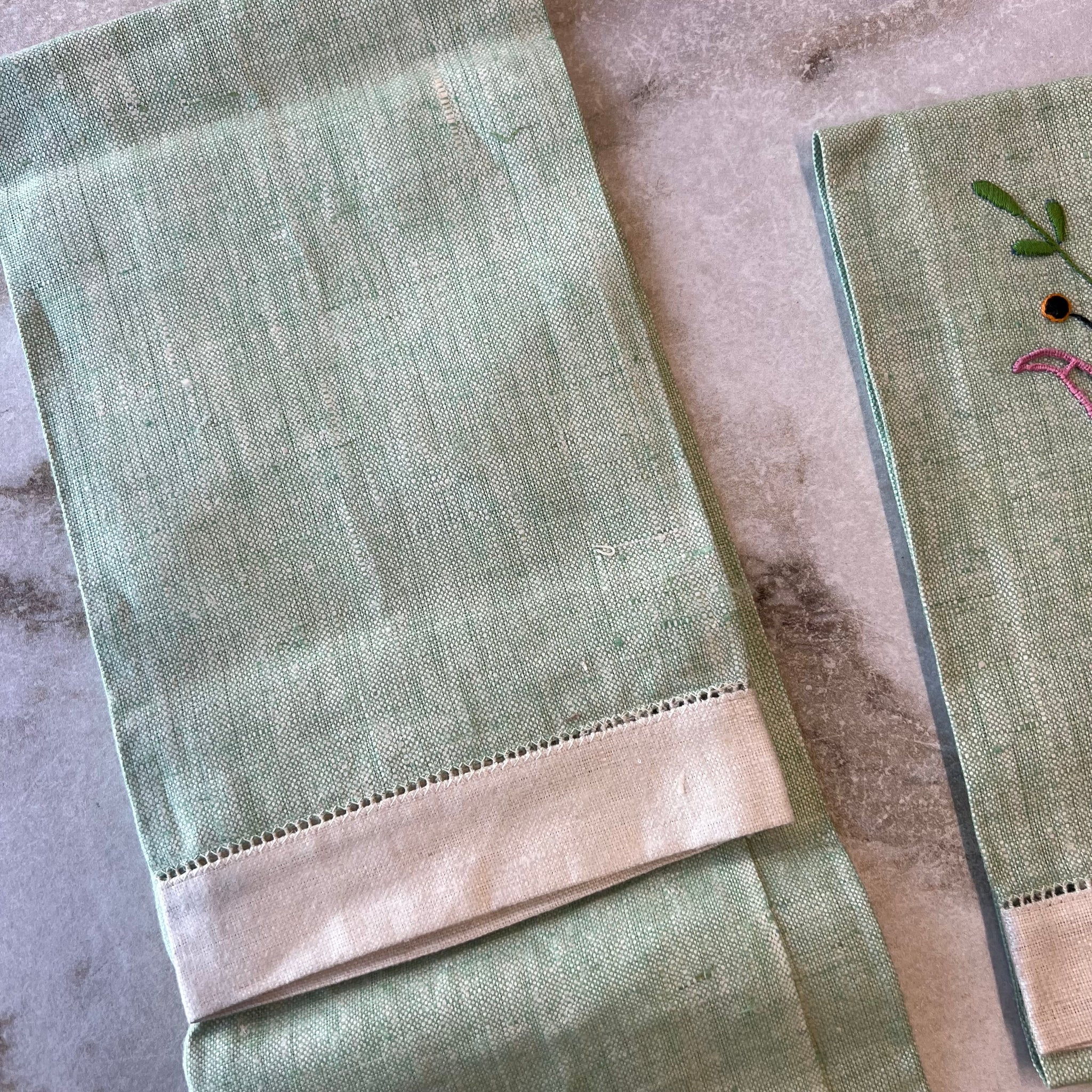 Ensemble (2) de linge à vaisselle vintage en tissu ressemblant à du lin. Avec décoration florale.