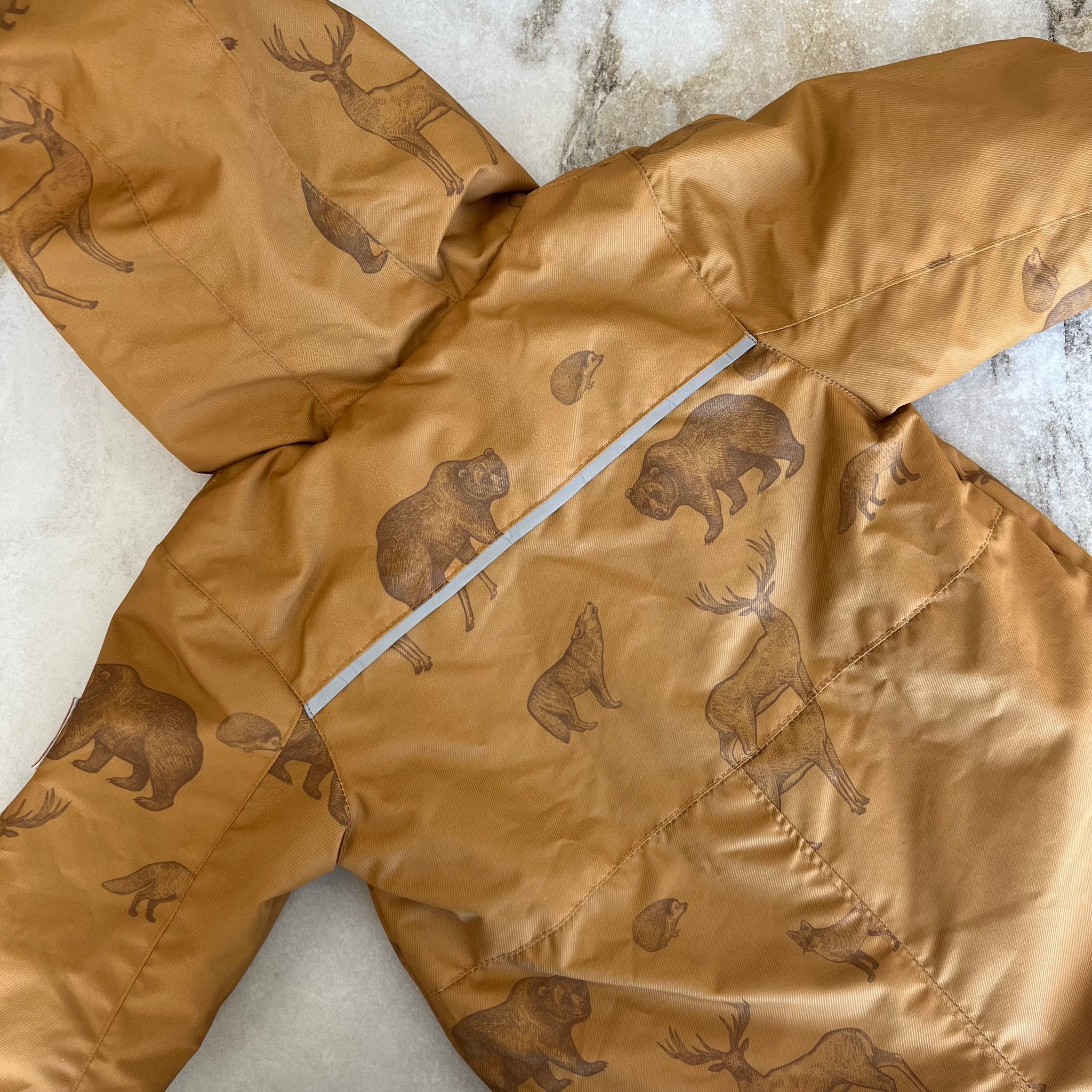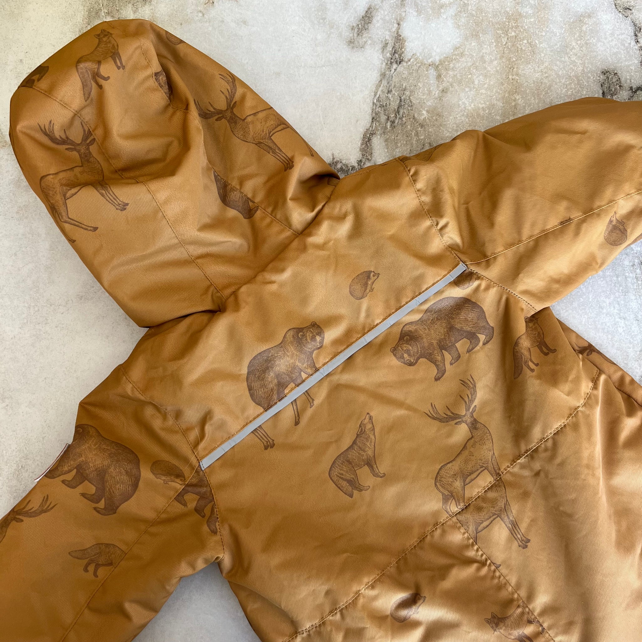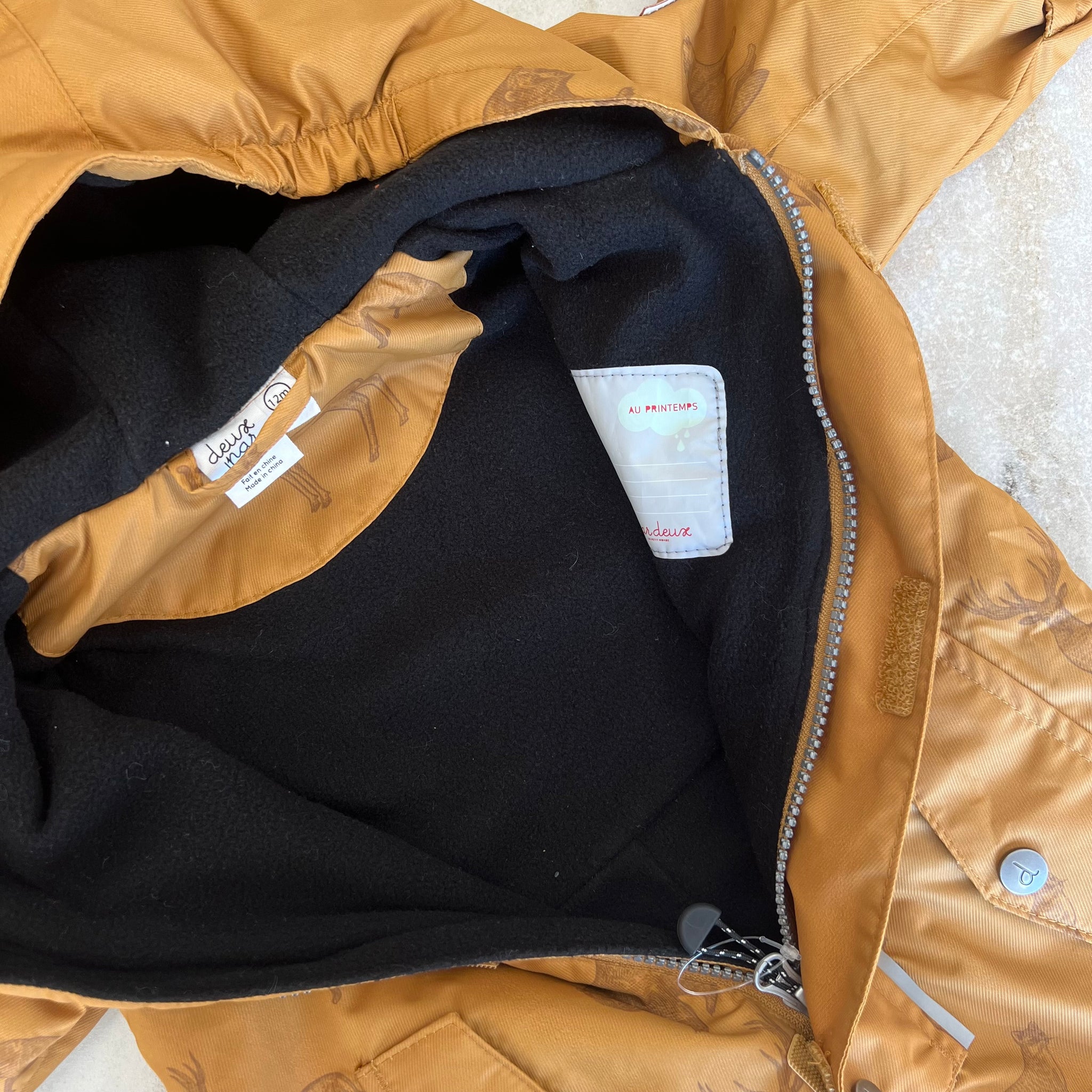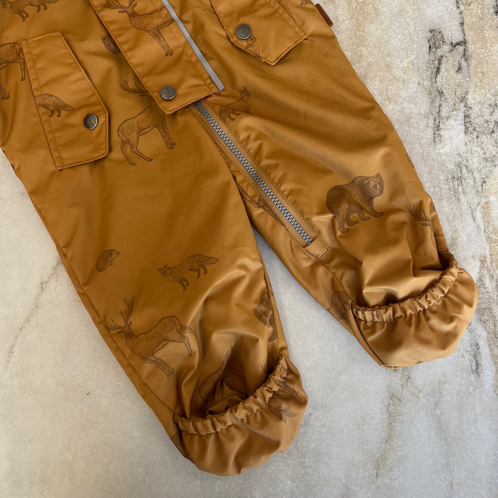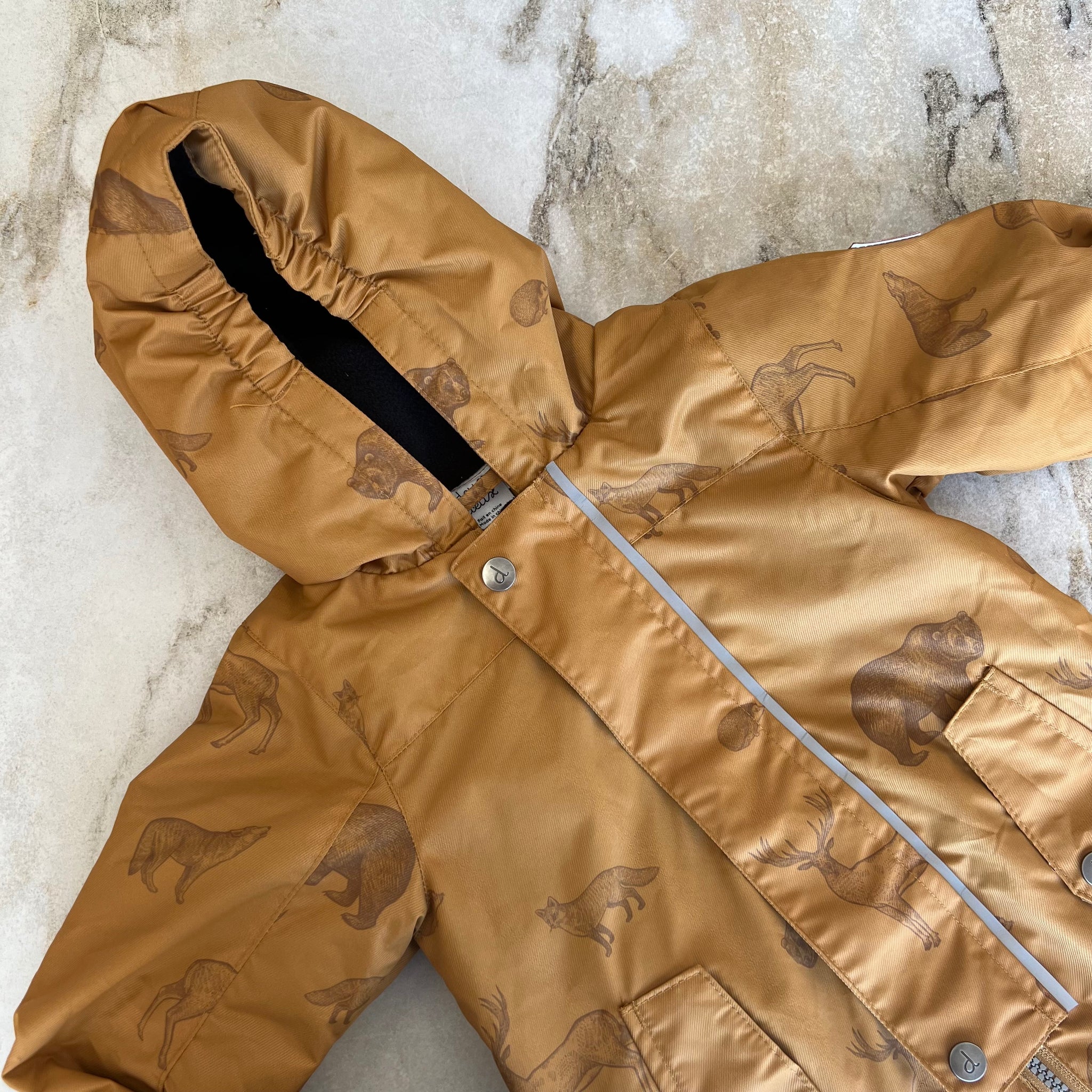 Ensemble une pièce à imprimés d'animaux de la forêt de la marque Deux par Deux. De la collection Au printemps. Capuchon couvrant, revers extensibles pour protéger mains et pieds, bandes réfléchissantes pour plus de visibilité, et poches avant faciles d’accès. Avec une étiquette d’identification intégrée pour inscrire le nom de l’enfant.