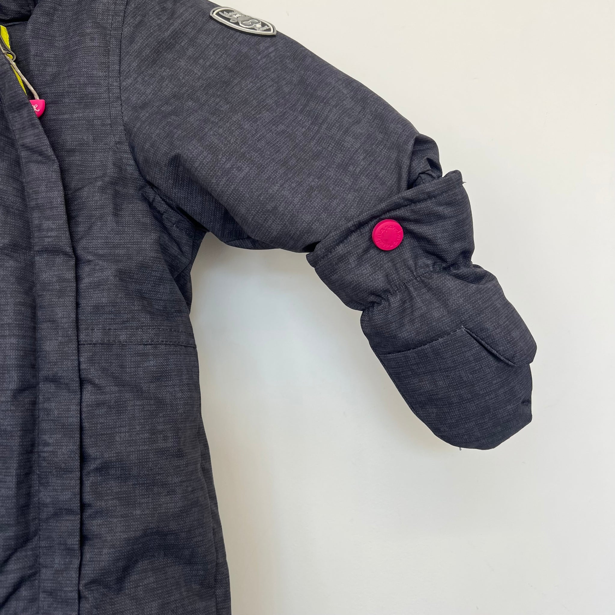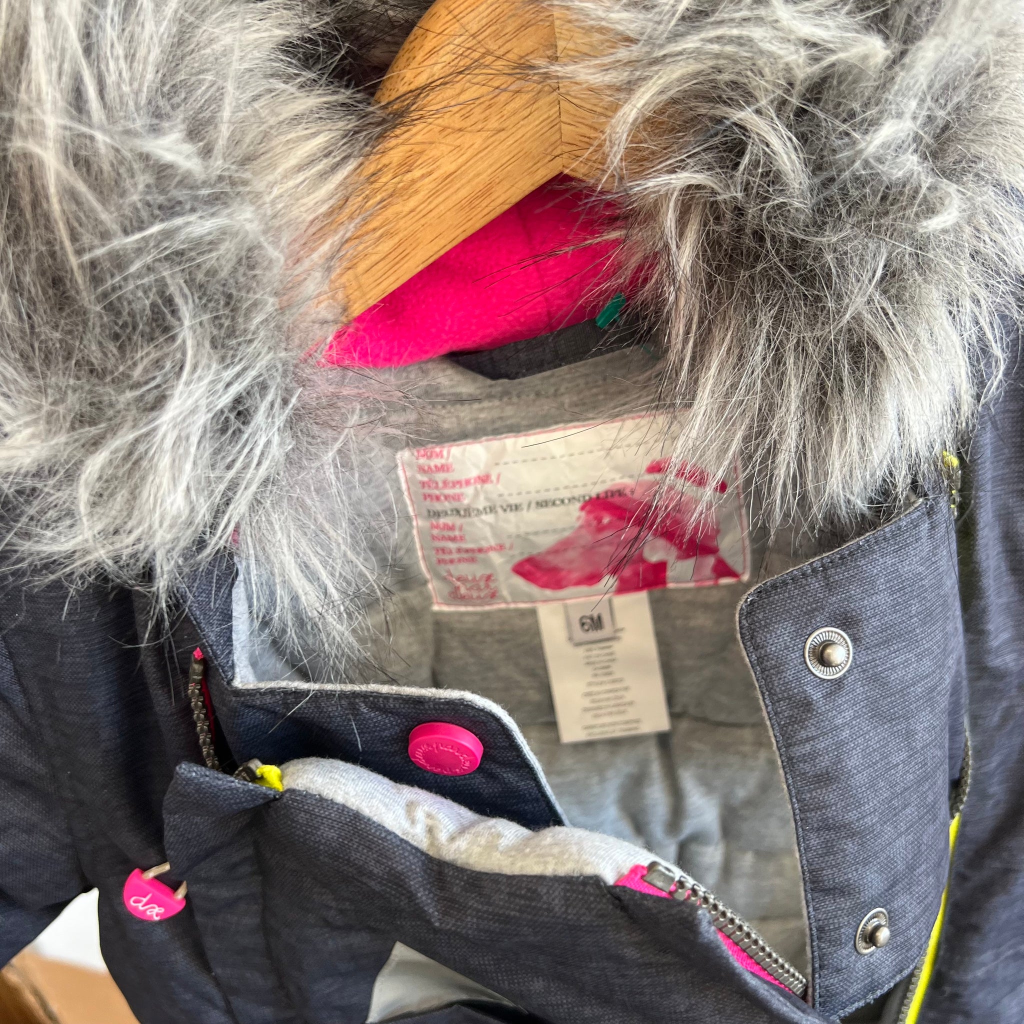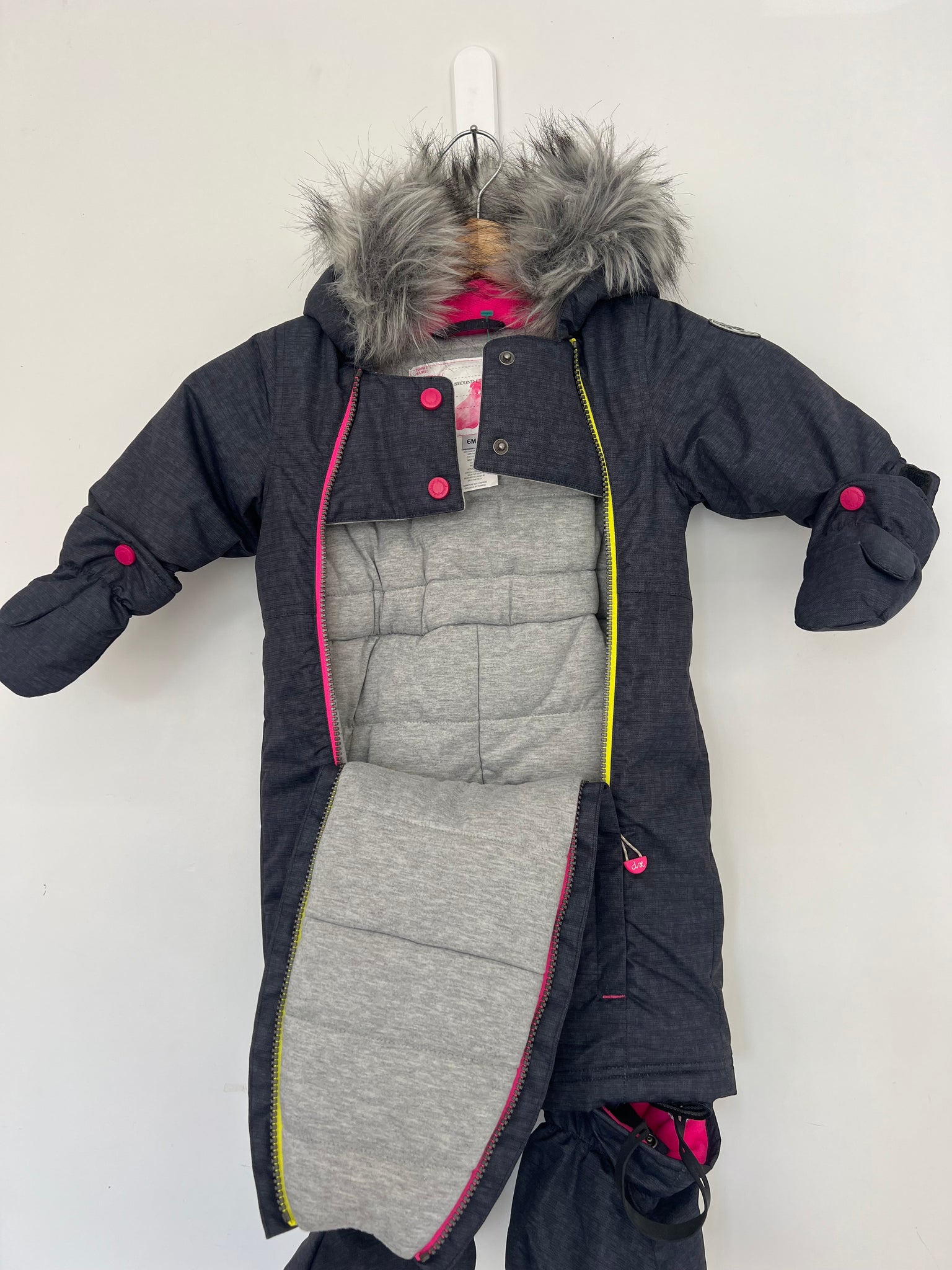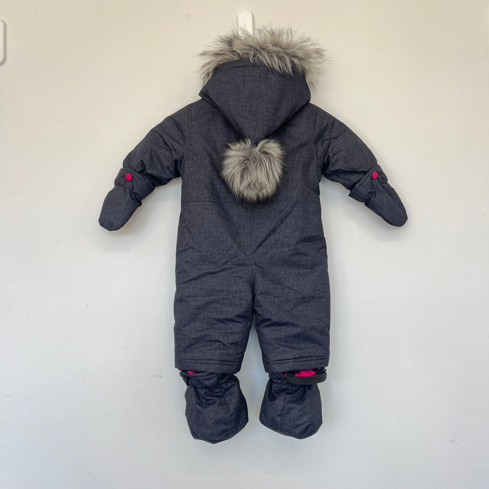 Manteau d’hiver une pièce doublé pour bébé de la marque Deux par Deux. Tissu enduit d'un revêtement de Polyuréthane qui le rend résistant aux intempéries et permet d'évacuer l'humidité Fermoir principal de qualité supérieure Ykk® robuste. Taille ajustable par l'intérieur. Pare-neige aux chevilles avec bande élastique caoutchoutée. Sangles en caoutchouc réglables au bas des jambes pour bien tenir en place les bottes. Bottines et mitaines amovibles avec boutons-pression doublé de polar. Capuchon triangulaire avec pompons et fourrure synthétique amovible. Isolation contre le froid jusqu'à -30°C(Ou -22°F). Avec une ouverture à double fermeture éclair à l'avant qui descend jusqu'à l'entrejambe.