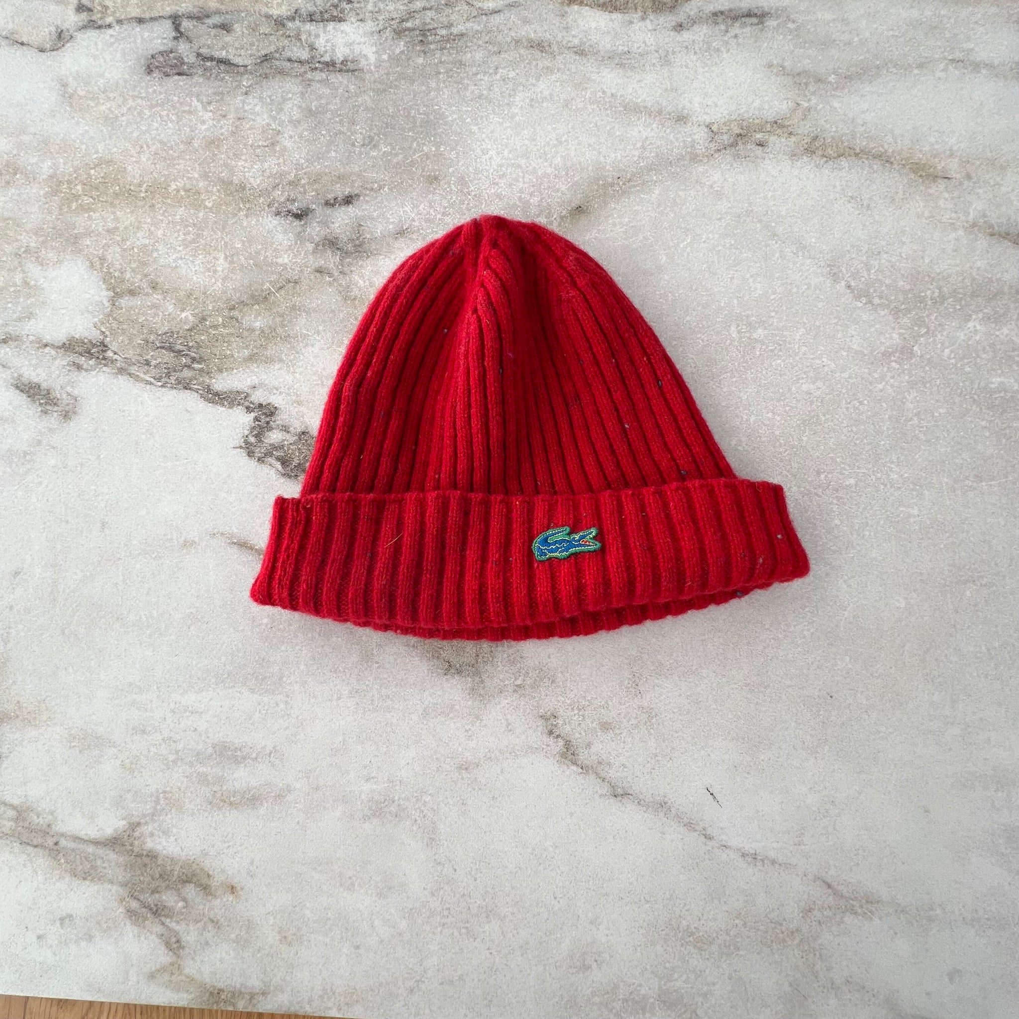 Ensemble foulard et tuque de la marque Lacoste. Avec laine coloré sur fond rouge.
