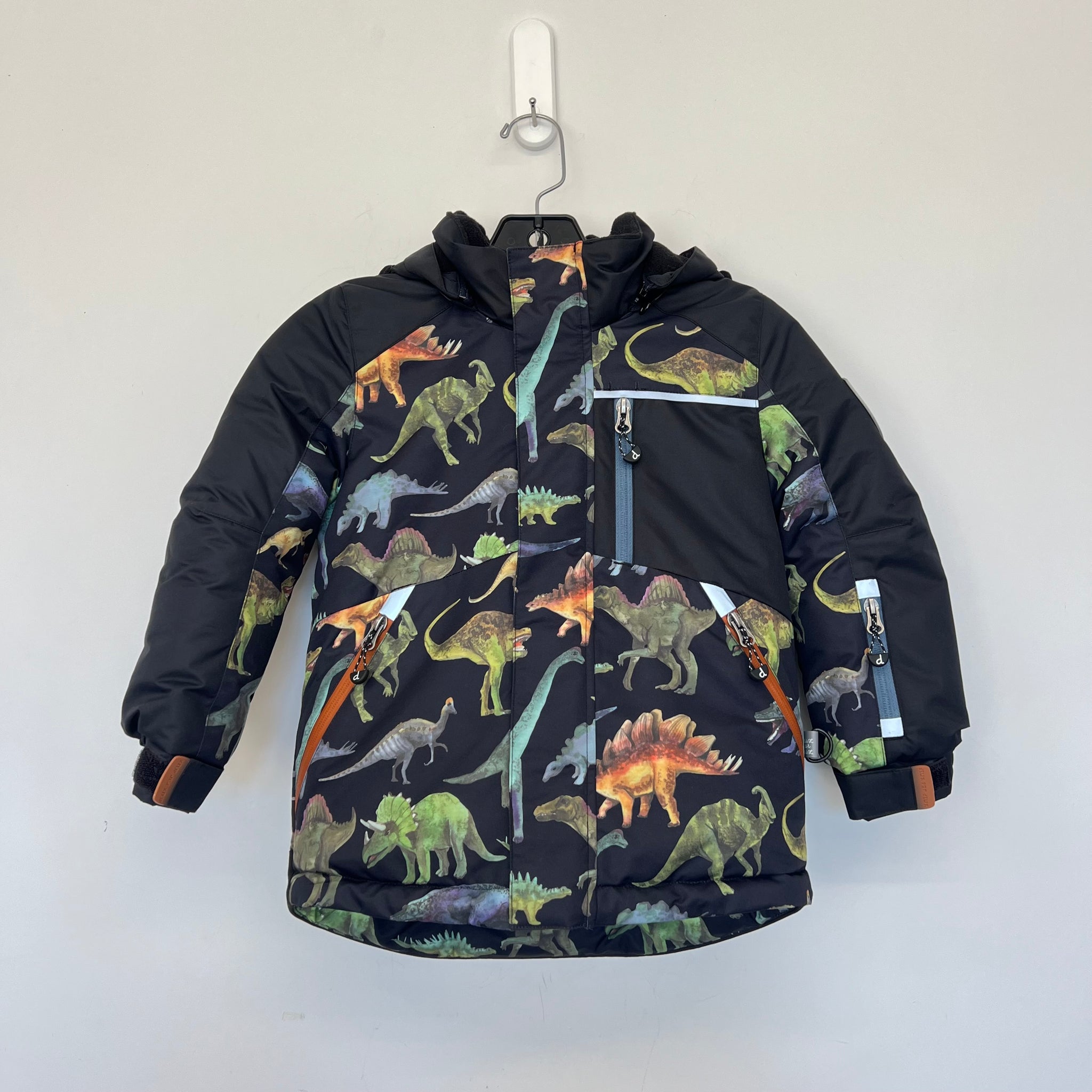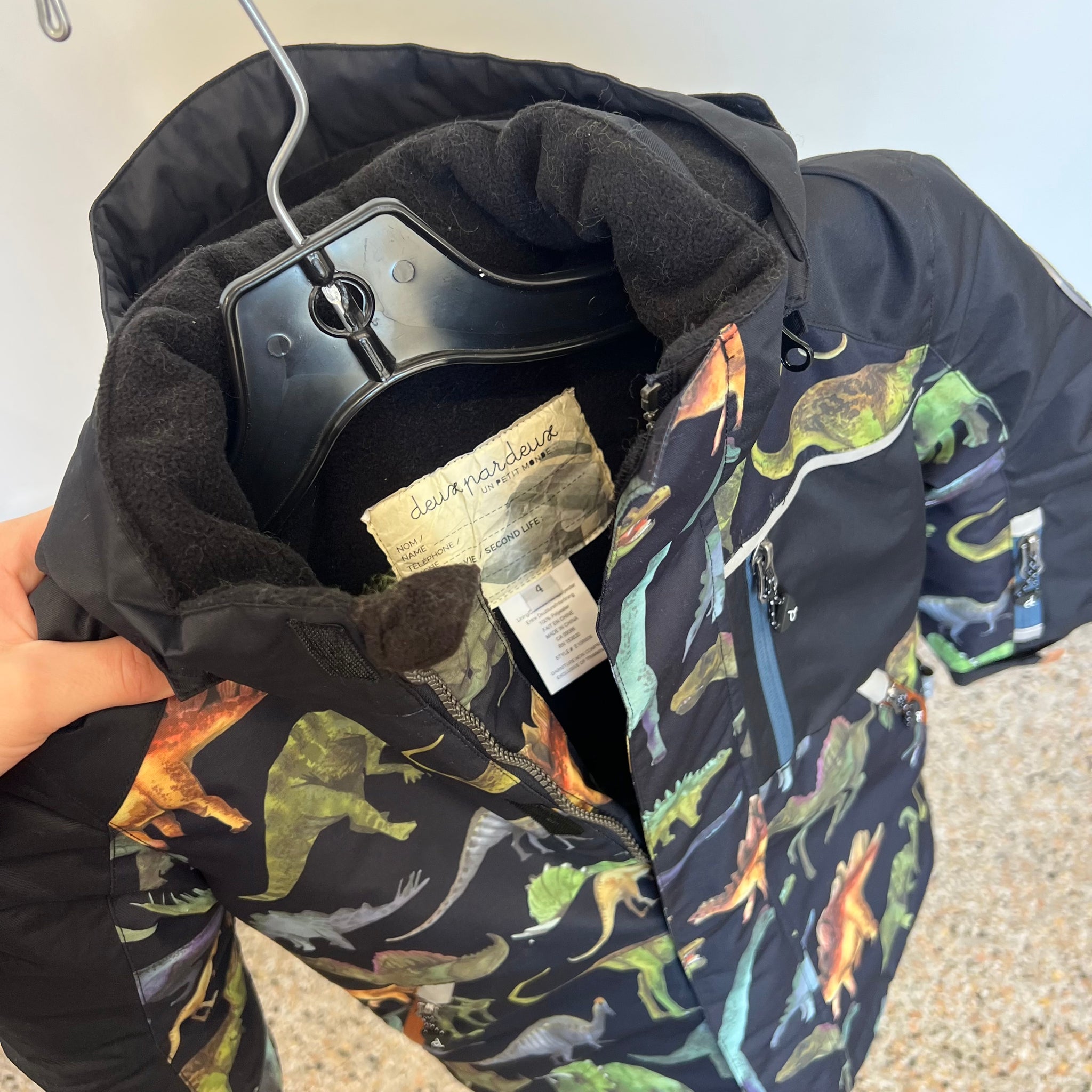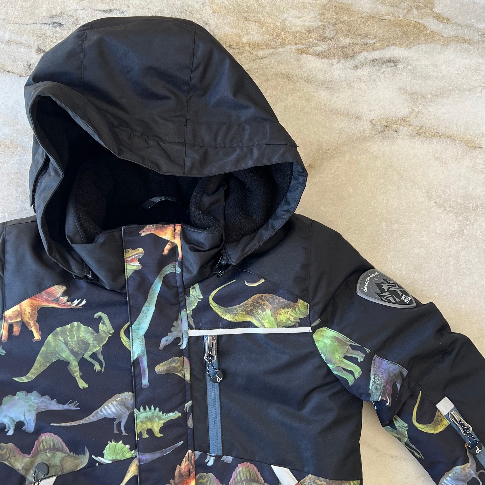 Manteau d'hiver aux imprimés de dinosaures de la marque Deux par Deux. Chaud et résistant, conçu pour affronter l’hiver jusqu’à -30 °C (-22 °F). Doublé en polar (corps, dos, col, capuchon), il offre une excellente isolation en fibres de polyester (capuchon 57 g, corps 170 g, manches 170 g). Le tissu est imperméable (5000 mm) et respirant (5000 g/m²/24h), idéal pour les jeux actifs et les sports d’hiver. Capuchon amovible et ajustable.Manches évolutives (+4 cm) pour suivre la croissance