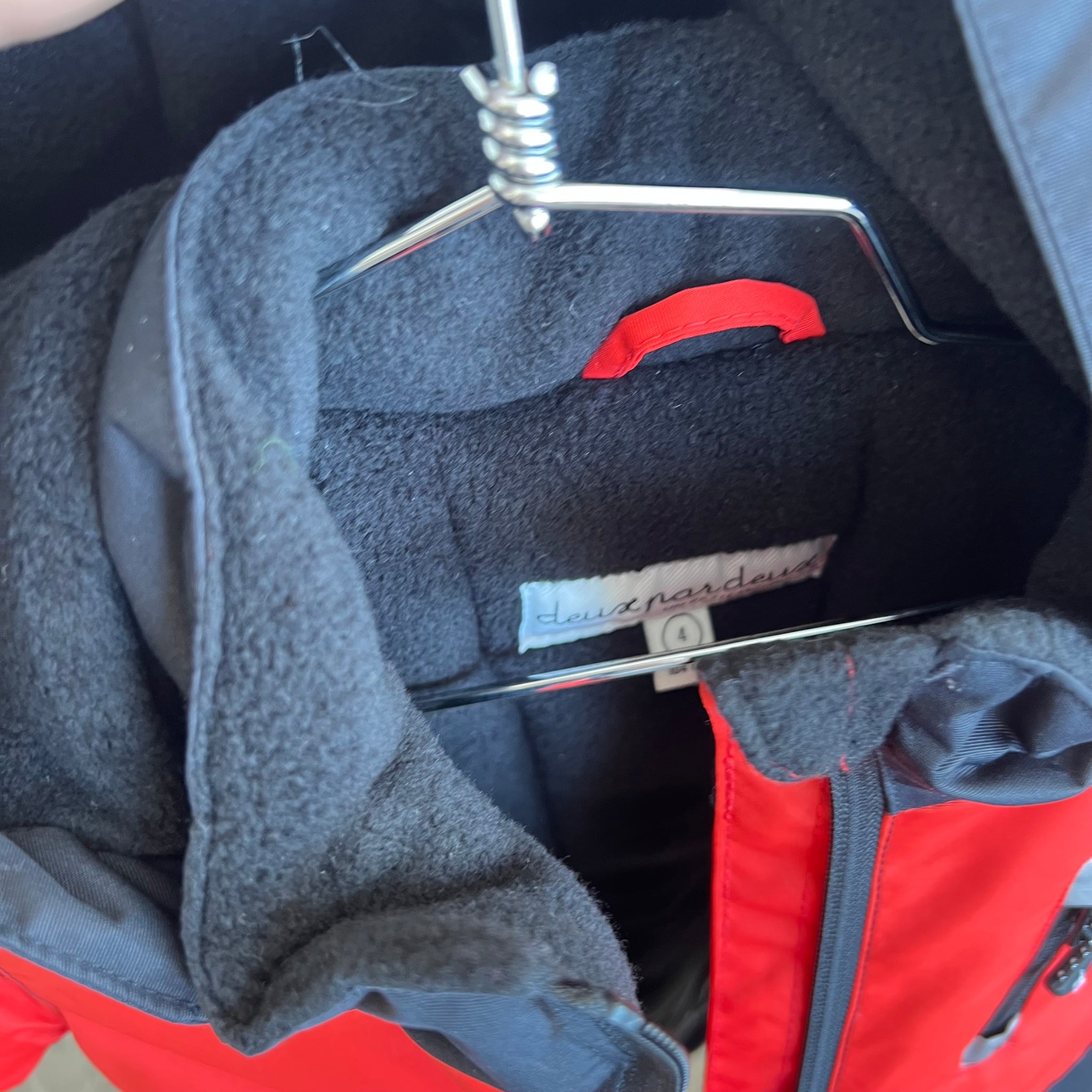 Manteau d'hiver de couleur noir, jaune et rouge de la marque Deux par Deux. Chaud et résistant, conçu pour affronter l’hiver jusqu’à -30 °C (-22 °F). Doublé en polar (corps, dos, col, capuchon), il offre une excellente isolation en fibres de polyester (capuchon 57 g, corps 170 g, manches 170 g). Le tissu est imperméable (5000 mm) et respirant (5000 g/m²/24h), idéal pour les jeux actifs et les sports d’hiver. Capuchon amovible et ajustable.