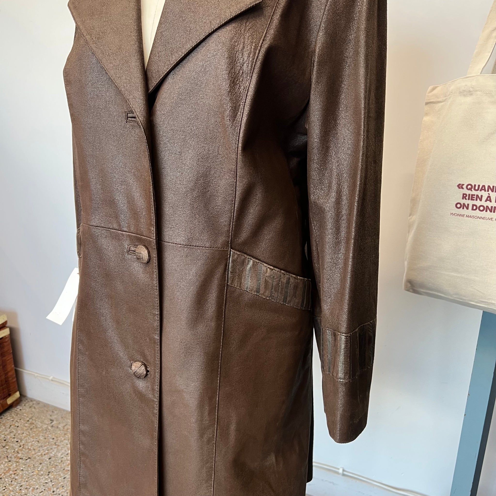 Manteau long en cuir véritable au style vintage. Col classique, fermeture à boutons sur le devant. Il présente deux poches avant avec rabat et bouton, ainsi que de superbes coutures qui témoignent de la qualité de sa confection.