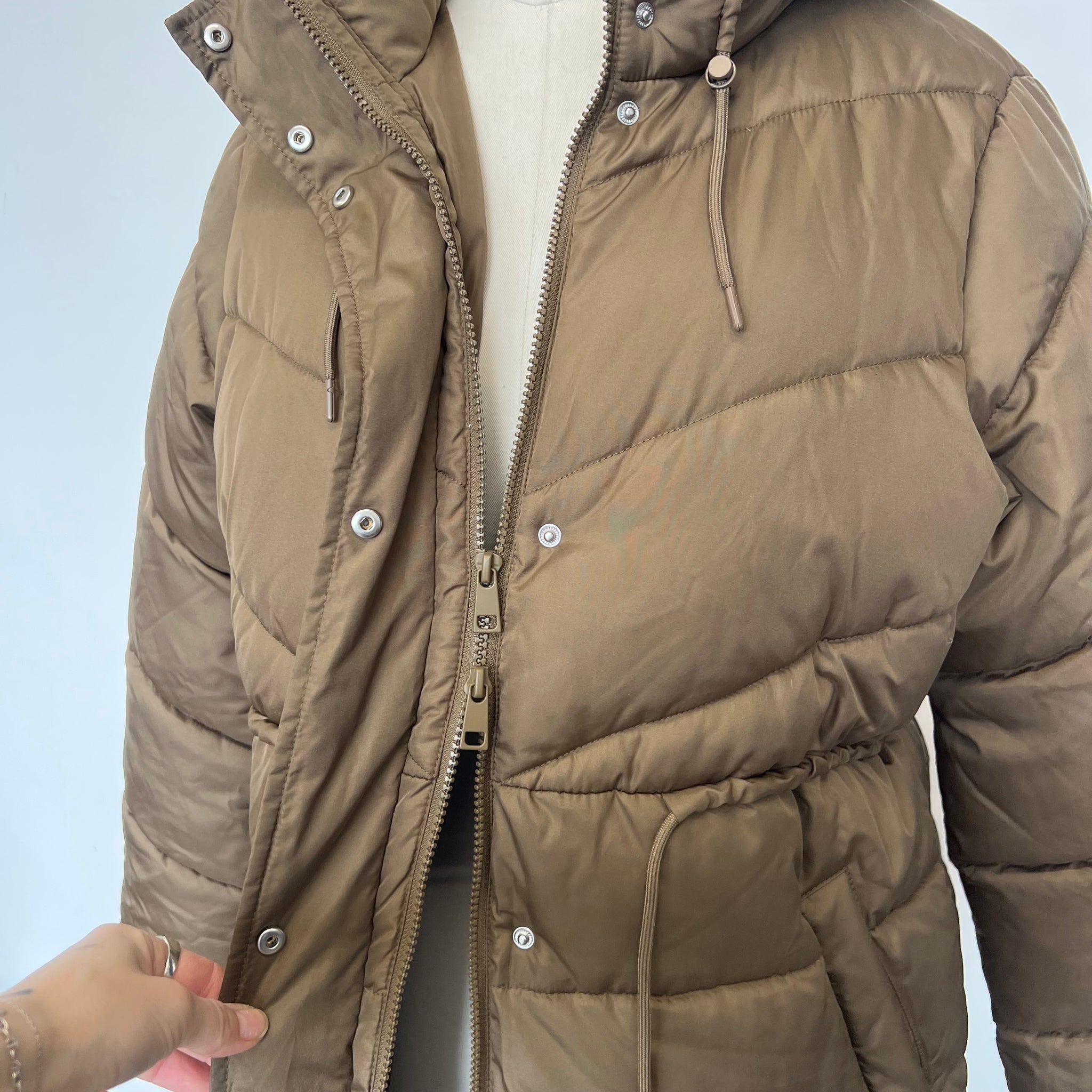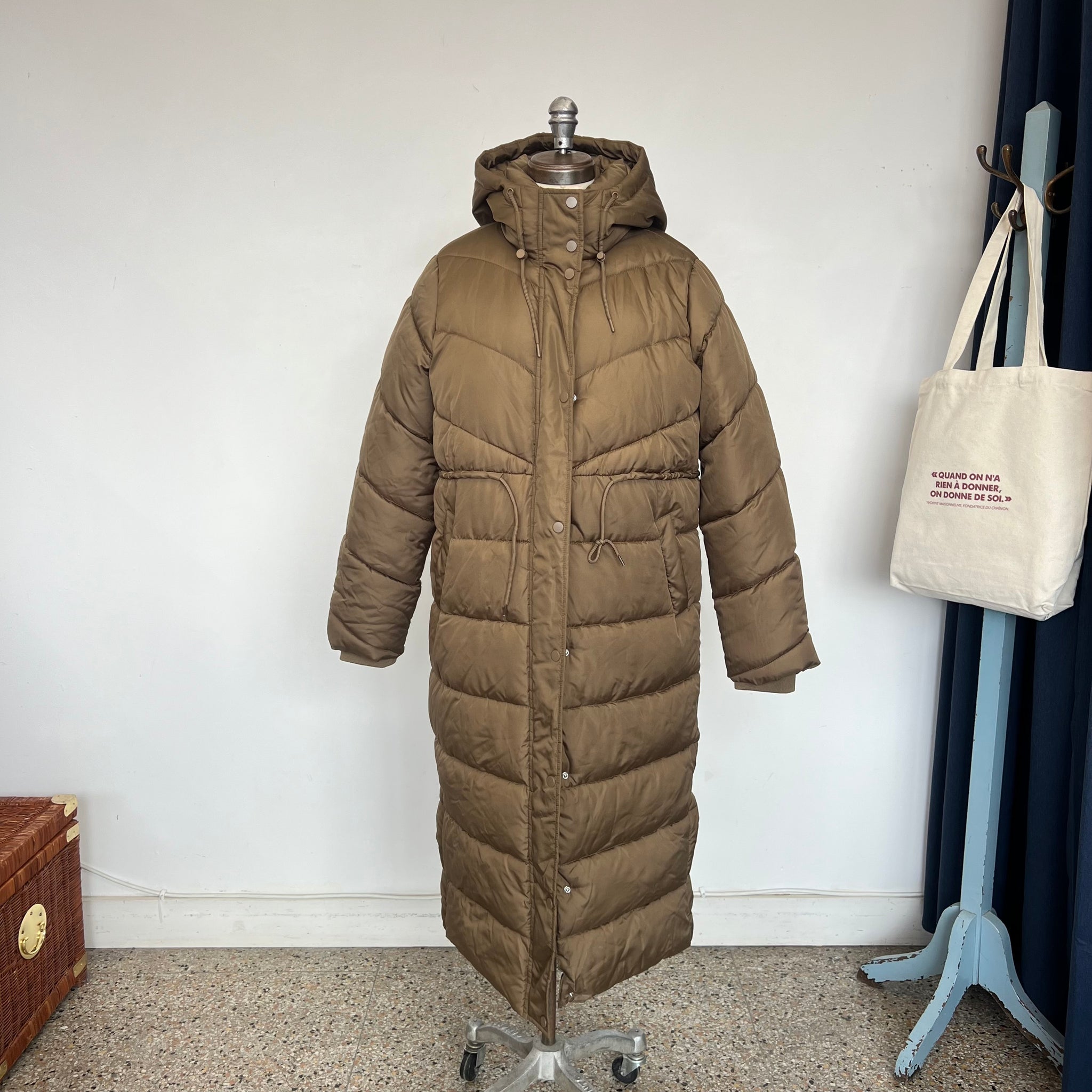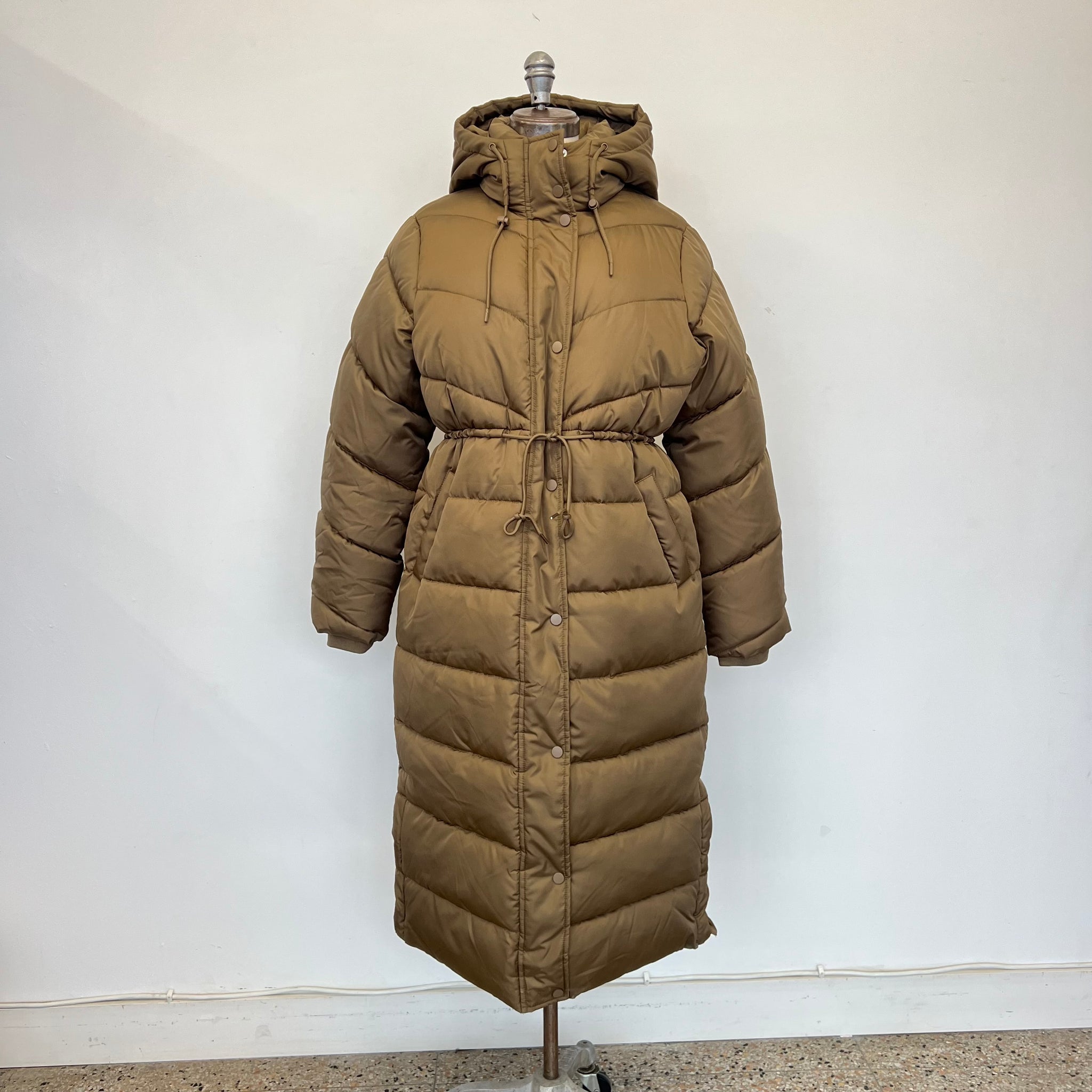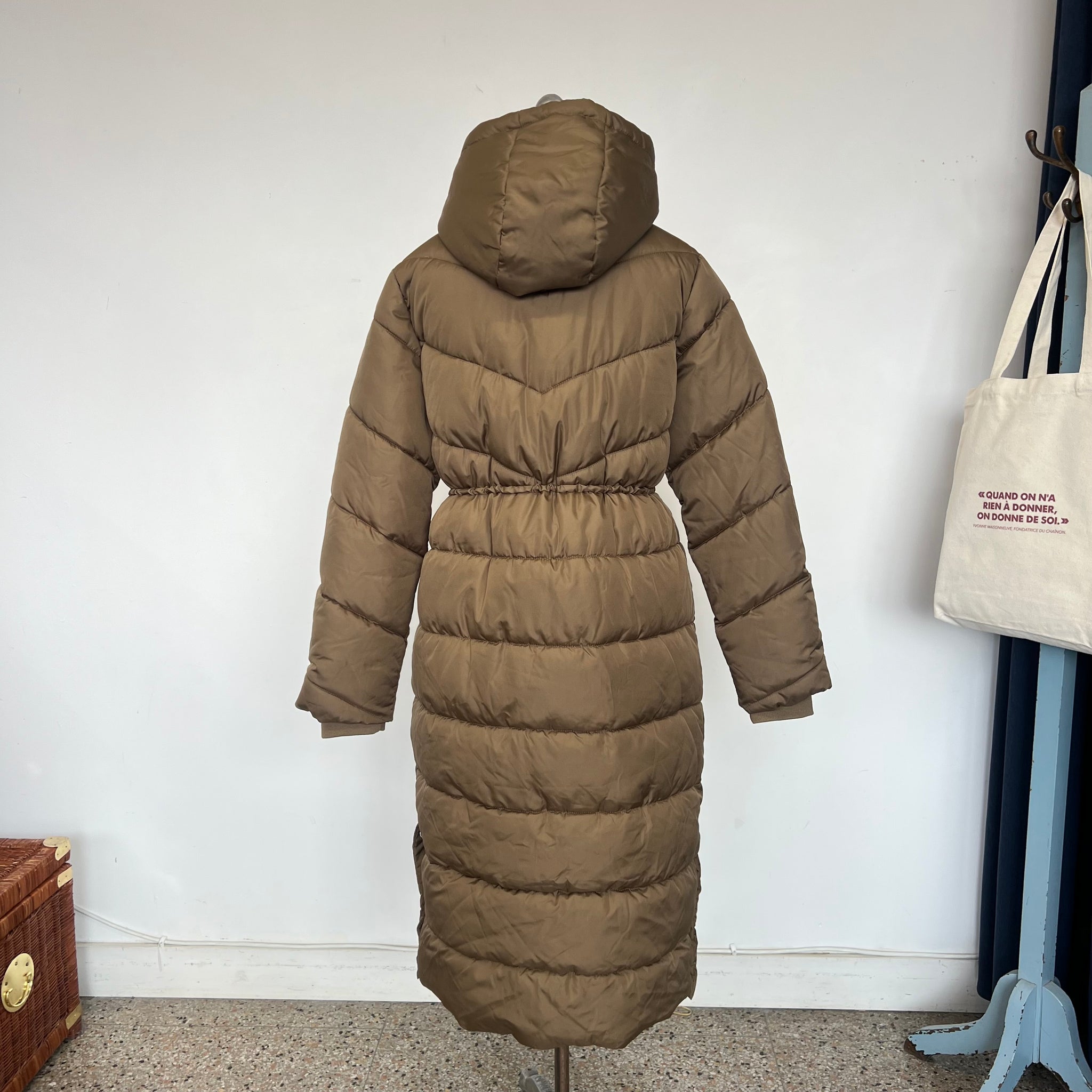 Manteau long matelassé de la marque JDY. Avec corde ajustable au niveau de la poitrine, deux poches latérales, boutons à pression pour fentes sur les cotés, boutonnière et fermeture éclair, fermeture éclair double, capuchon avec corde pour serrer.