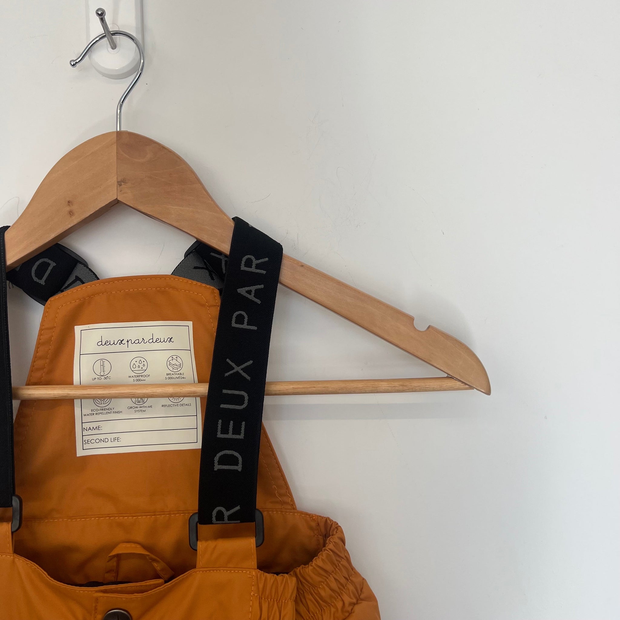Pantalon de neige de couleur orange de la marque Deux par Deux. Chaud et résistant, conçu pour affronter l’hiver jusqu’à -30 °C (-22 °F). Isolation en fibres de polyester (170 g), tissu imperméable (5000 mm) et respirant (5000 g/m²/24h), idéal pour les activités hivernales. Résistance à l'usure : Jusqu’à 30 000 frottements. Traitement déperlant : BIONIC-FINISH® ECO, sans fluorocarbones (PFAS, PFOS, PFOA).