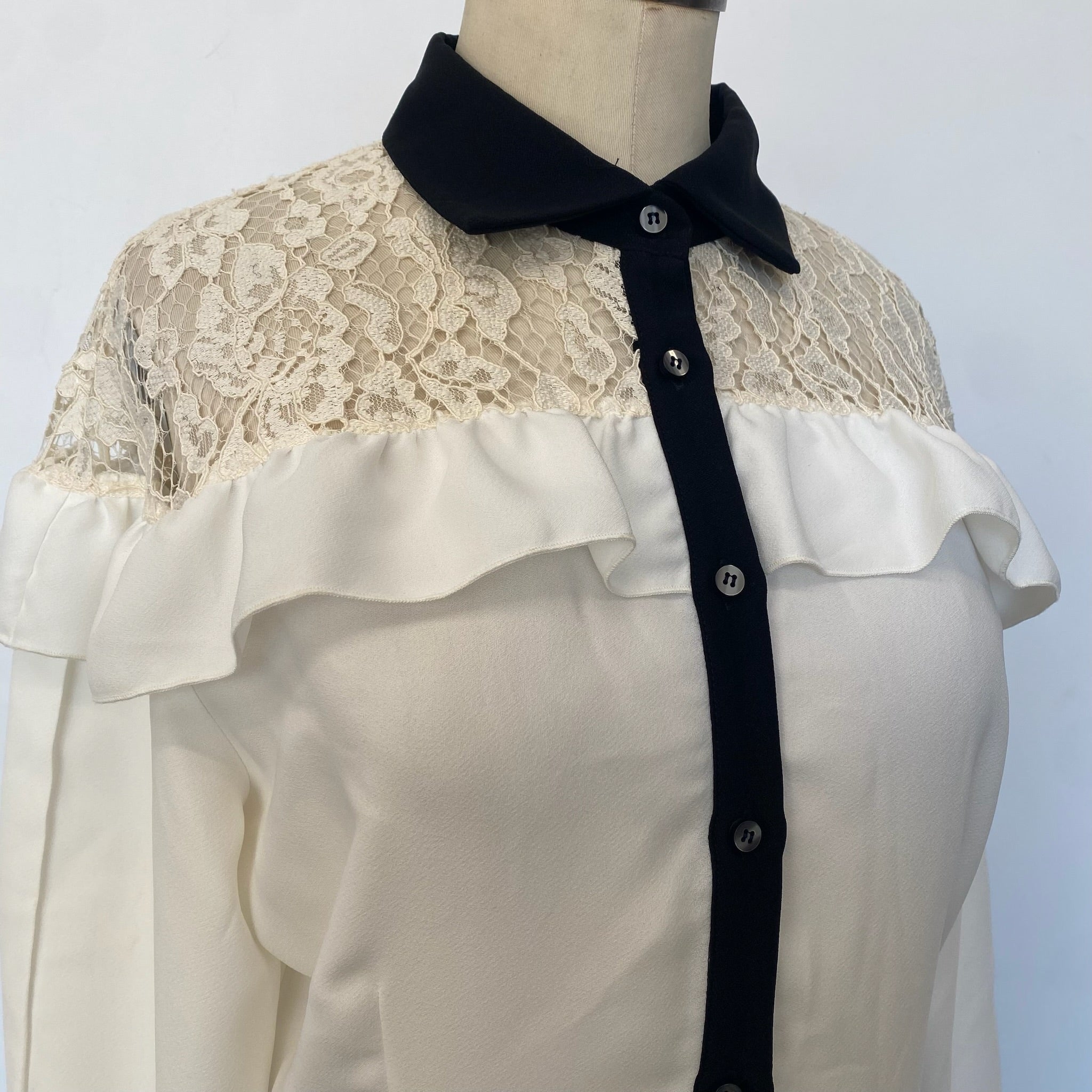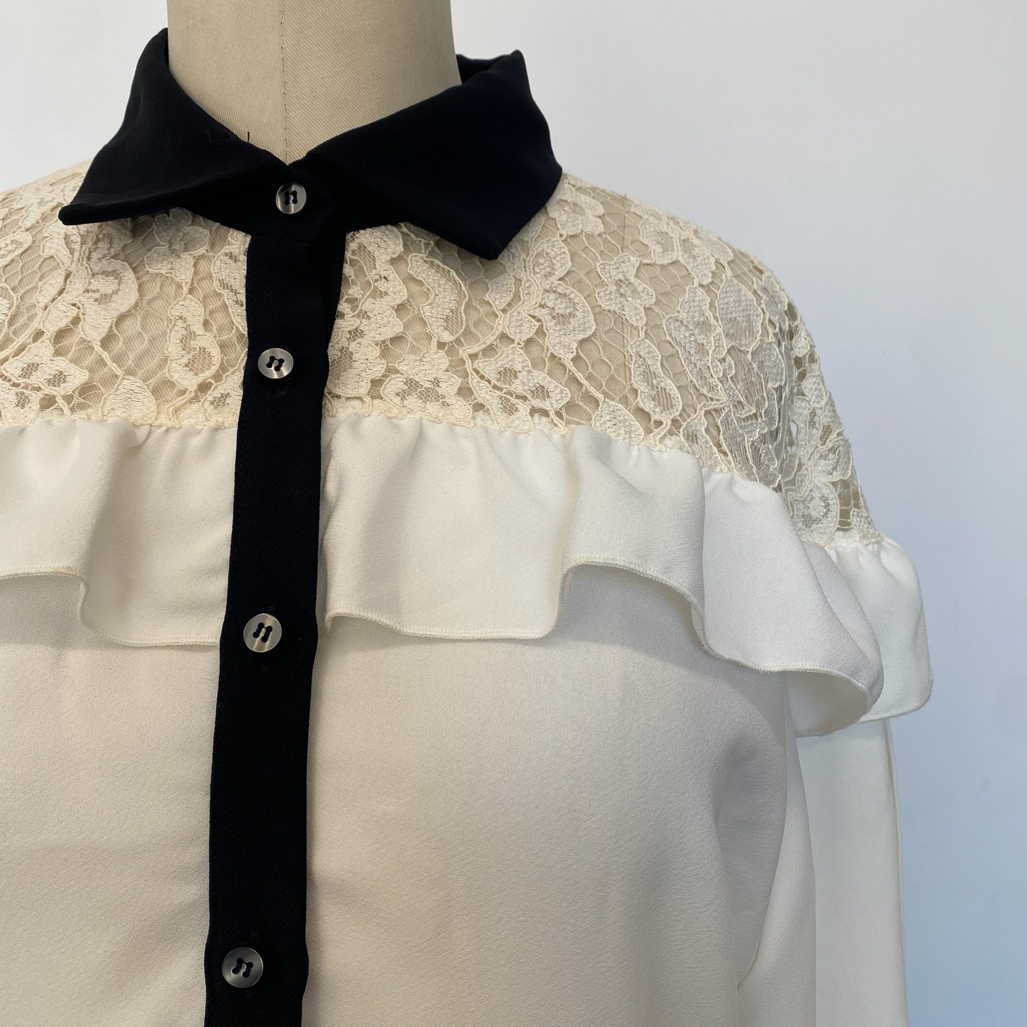 Élégante robe de la marque Co|te. Col classique, fermeture à boutonnière, pinces à la poitrine, fermeture à glissière sur le côté gauche et bouton aux manches. Détails de dentelles et de fronces. Tissu non doublé, partie blanches légèrement transparente. D'une valeur de 895,00$.