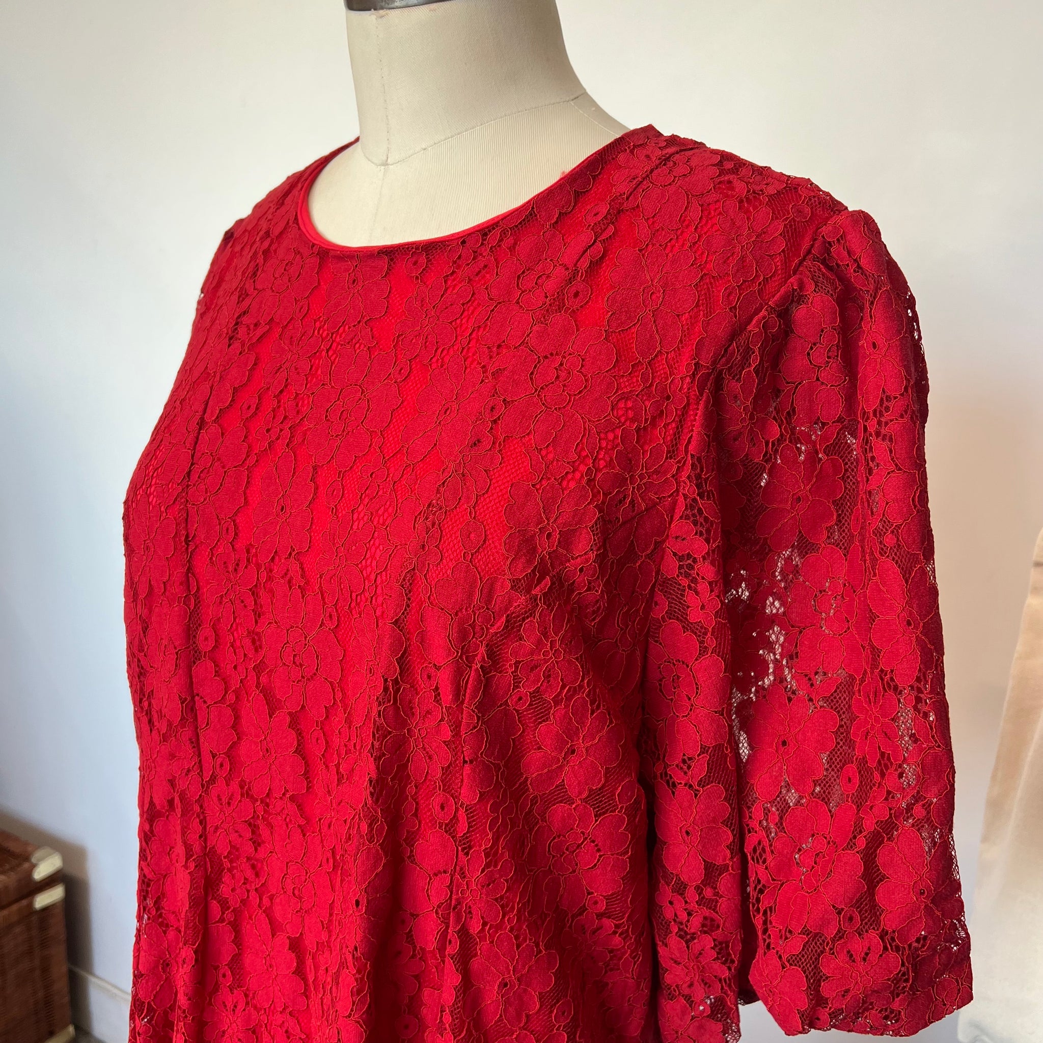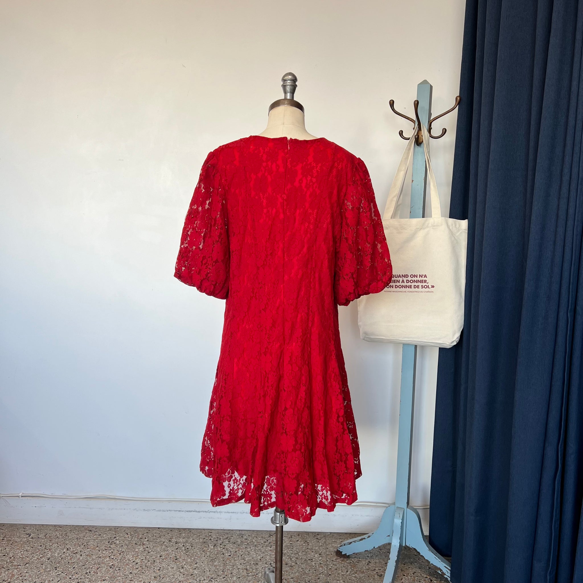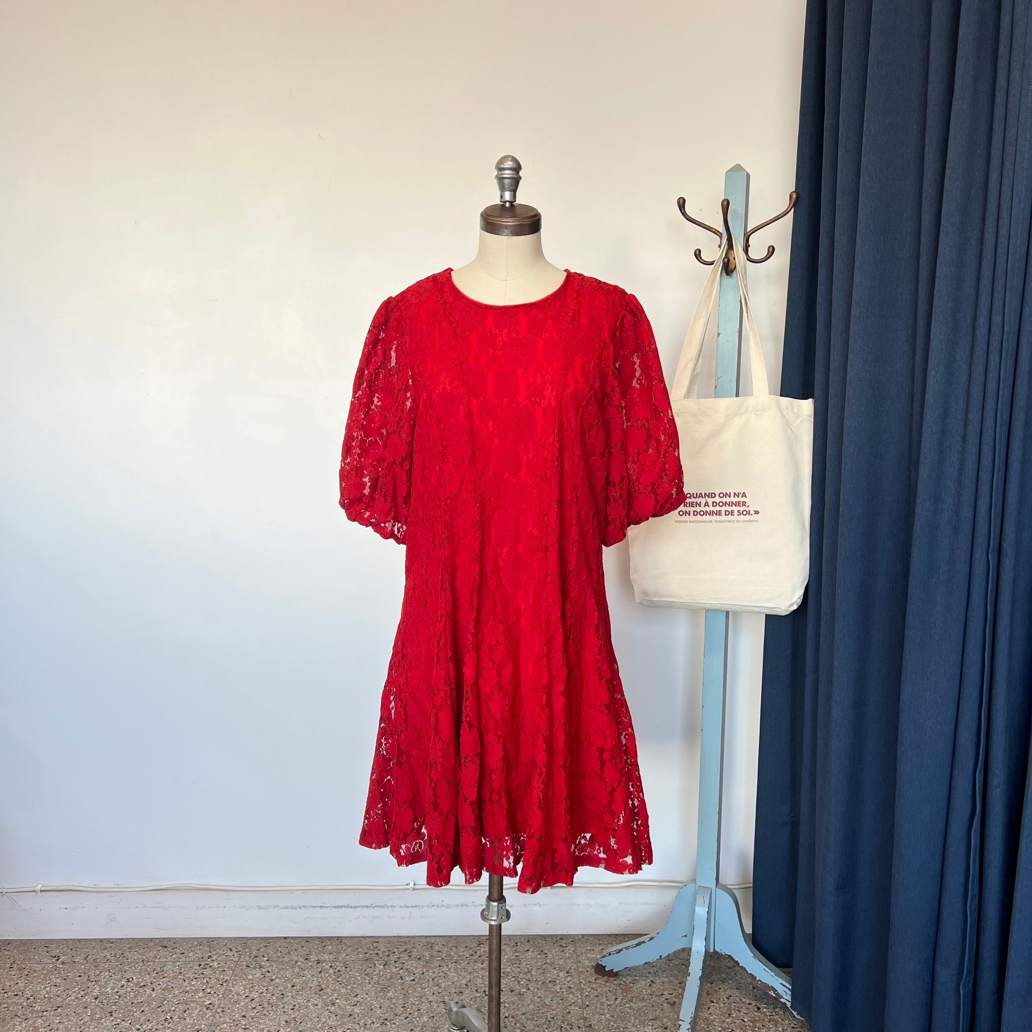 Robe aux motifs floraux en dentelle et à manches courtes bouffantes de la marque québécoise Annick modèle Calista RD. Doublé sauf aux manches. Avec élastiques aux bouts des manches et fermeture éclair discrète aux dos.
